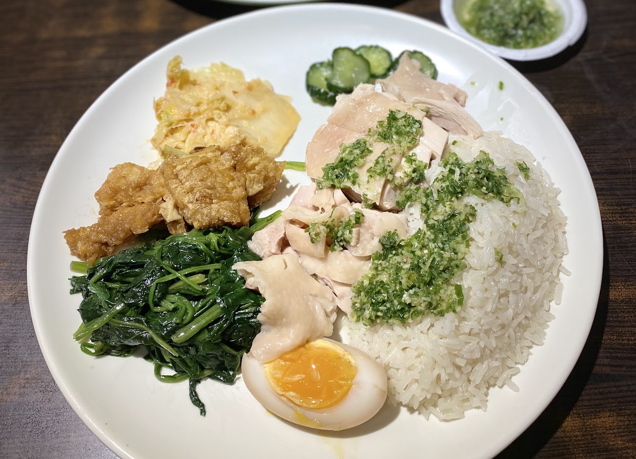 上面的蔥醬是自己淋的 推薦你們一定要加啊!!!!! 它們家的蔥醬超香超好吃? 淋在海南雞飯上很提味♡´・ᴗ・`♡ 也很下飯 旁邊的配菜不固定 但基本上都會有蛋跟菜 小菜表現中規中矩 但有菜有蛋 算是營養滿分了?