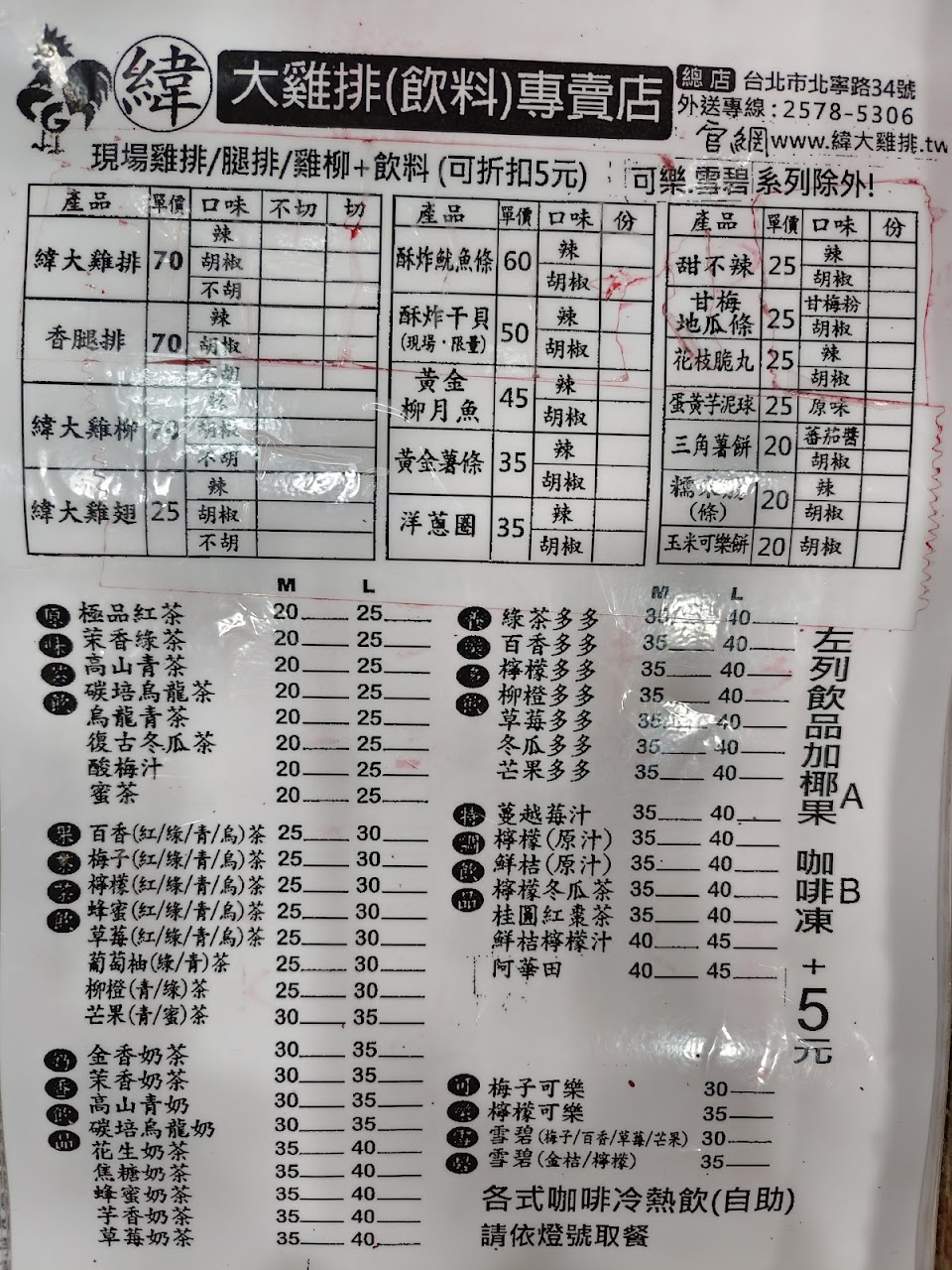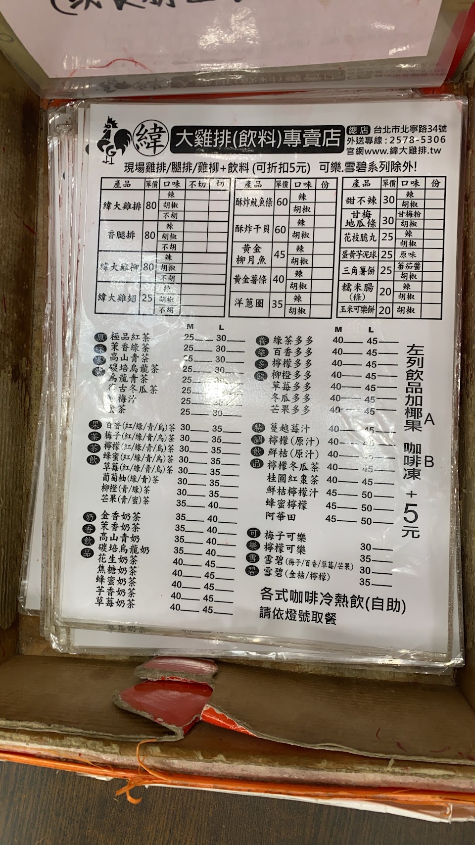 緯大雞排飲料專賣店: 由劉紹緯先生於民國95年9月成立至今,傳承景美著名的張媽媽雞排口味和技術,獨家調味,外酥內嫩,廣受上班族喜愛,成為台北人氣美食,下午茶首選。