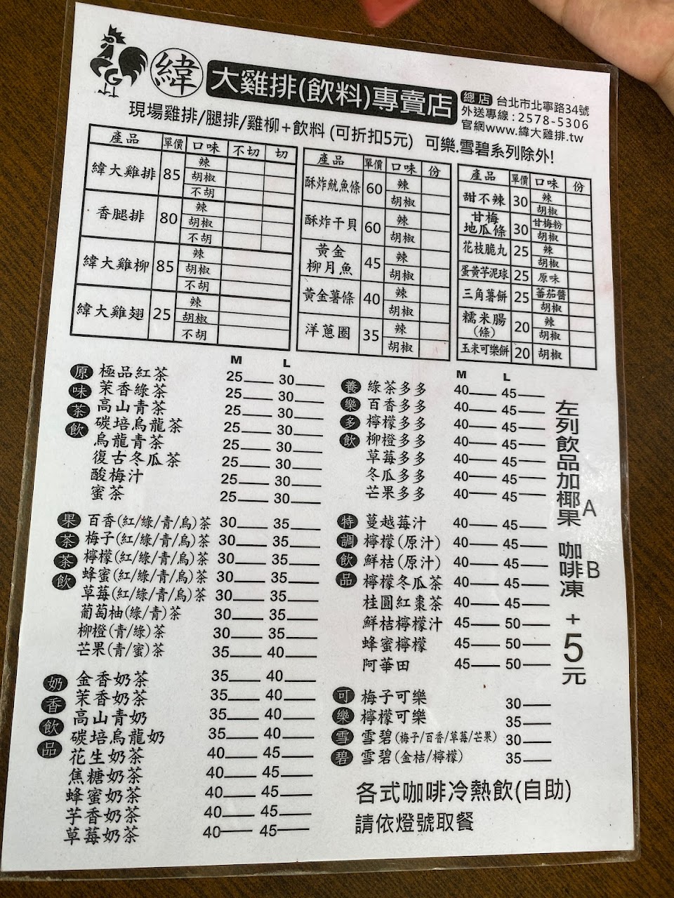 小巨蛋旁北寧路上的這家雞排店可說是名聞遐邇、縱使是到了離峰時段也是店門口前排滿滿在等雞排;從店面門口就可以看到一張張炸得比臉大的雞排甸甸的炸好在一旁瀝油就讓等待的人們很是期待;而雖說菜單上的品項就簡簡單單那幾項,但排隊等待的人潮從點餐到拿到餐點還是要費上個十幾分鐘才可以拿到,顯見這家的熱門程度。而在一旁也有同名的緯大飲料專賣店和緯大食堂,想必是用餐時皆可輕鬆享用到雞排店的產品。