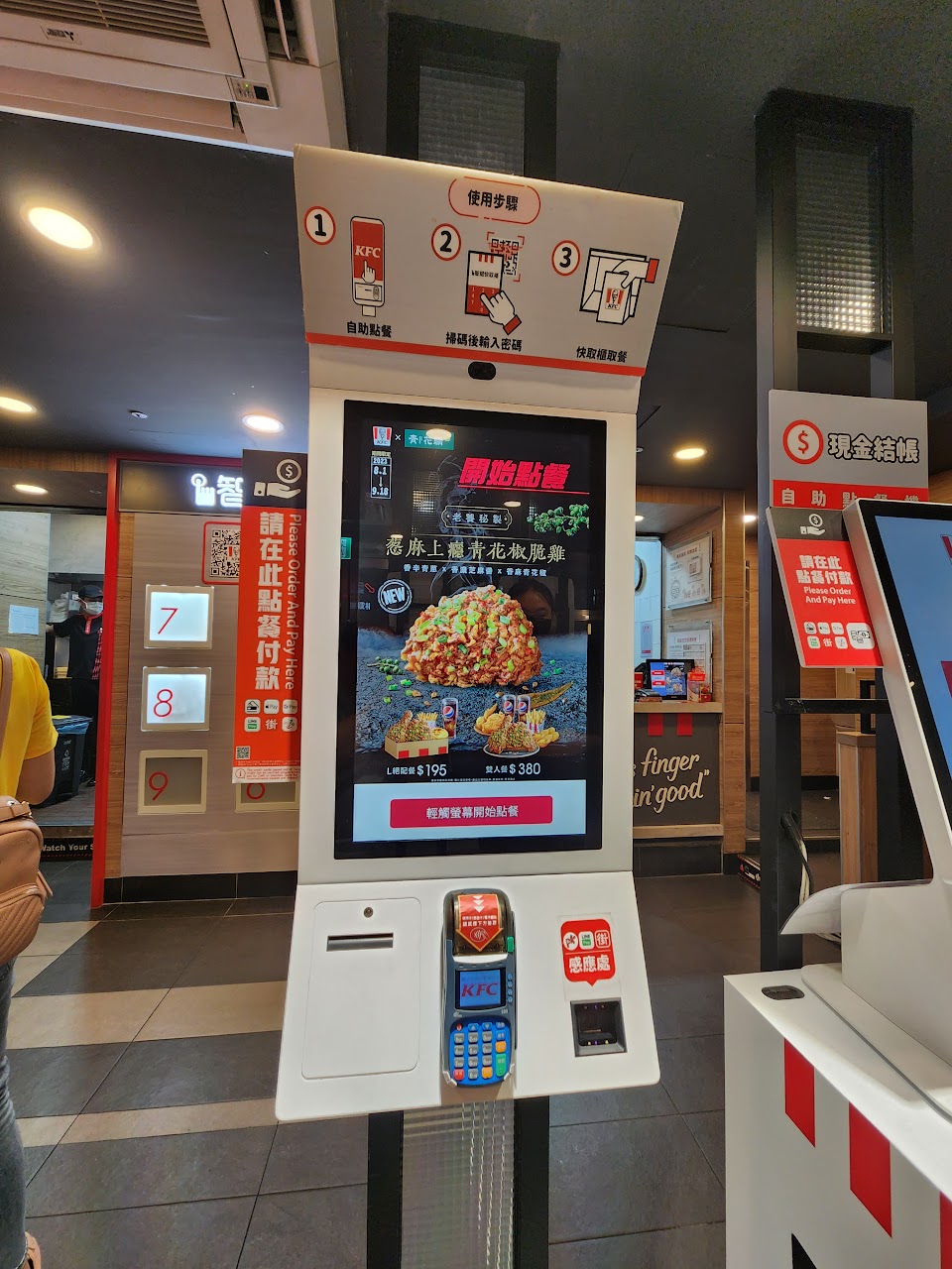 點餐只能透過機器,取餐也是,需要輸入密碼後取餐,餐廳還是有服務員,但就不會負責點餐取餐,有點多此一舉,這家的環境衛生有待加強