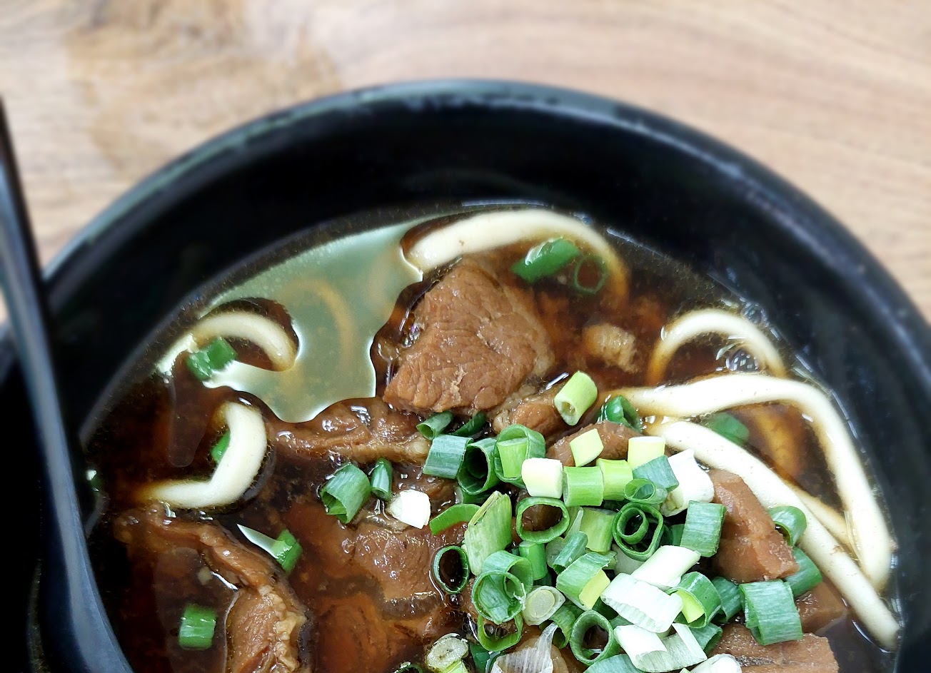 開業多年的牛肉麵,麵體不像刀削的長片狀,但依然Q彈有勁但又不會太硬;紅燒湯頭喝起來夠味不油膩 也不會過鹹,牛肉雖然薄 但是有非常多塊;桌上還有辣牛油跟酸菜,可以讓整個湯頭喝起來更有層次,價格不貴,相較現在台北動輒兩百塊的牛肉麵比起來,價格110十分划算好吃。