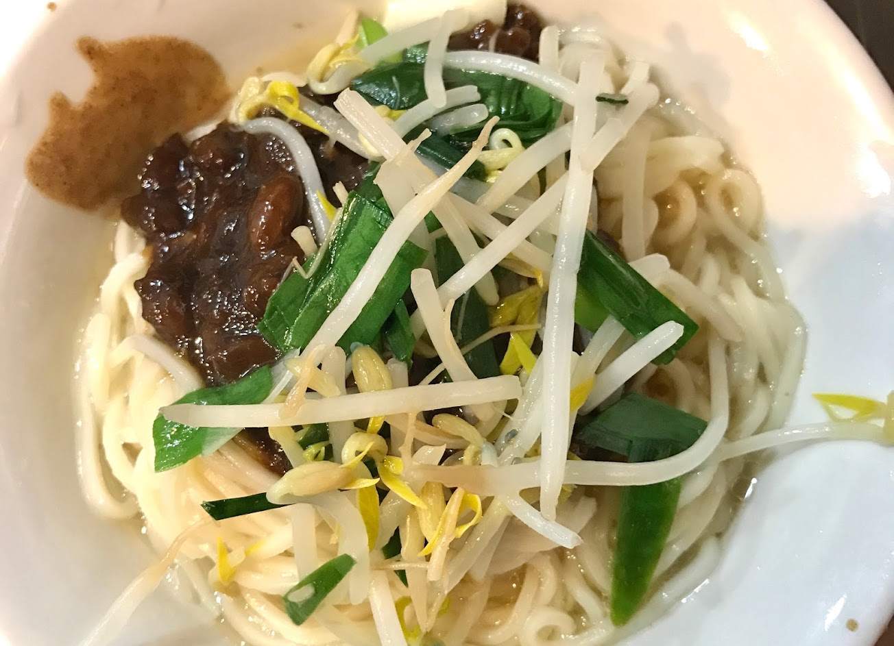 陽春麵加辣沙茶!超奇怪的味道!吃不習慣!推薦隔壁的八方雲集古早湯麵好吃!雖然貴五元!但是有其價值的好吃!