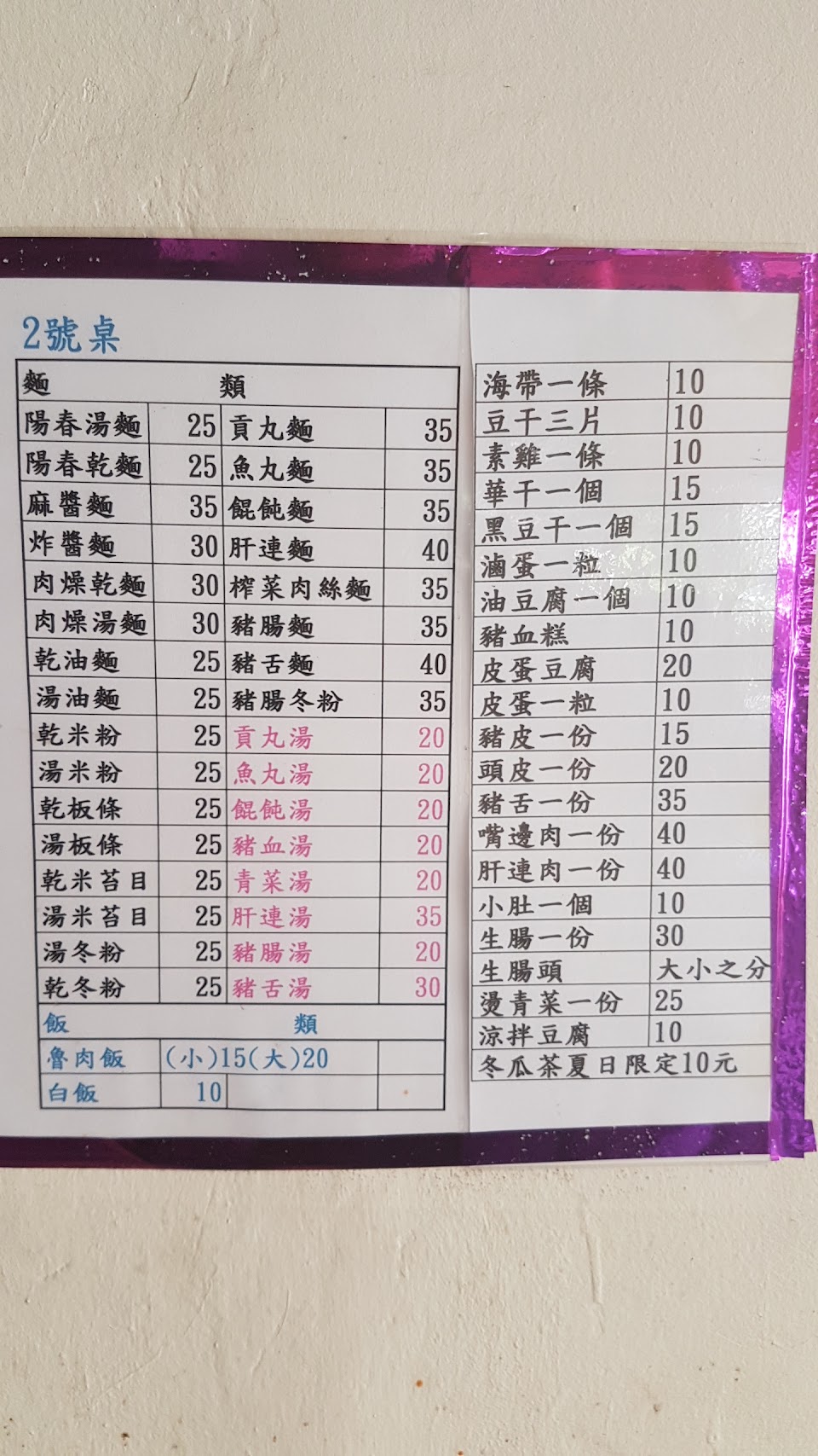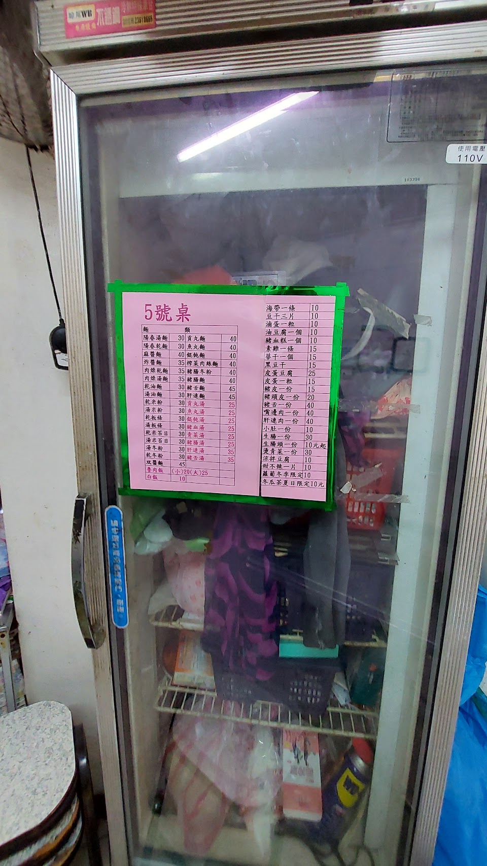 豬腸冬粉$40 燙青菜$30 蘿蔔$10 油豆腐$10 甜不辣10