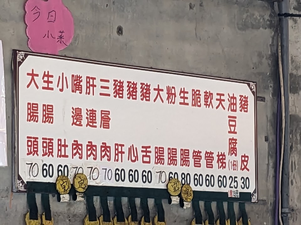 主食是米粉湯(不分大小、可加湯)、涼麵(分大小碗,可加辣、也可自己加芥末)。黑白切選項很多、有十幾種,但比較熱門的嘴邊肉、生腸,經常在中午前賣完。除了菜單上的選項,熟客會點隱藏版,例如「綜合腸」(包括脆管、生腸頭、大腸、大腸頭、粉腸等)、「綜合肉」(包括三層肉、嘴邊肉、肝連肉),一份都是70元。「生腸」和偶爾會出現的「腰花」則是一份80。非常推薦嘴邊肉、豬舌、豬皮、生腸、大腸頭。加上辣椒醬油膏和薑絲,堪稱人間美味。