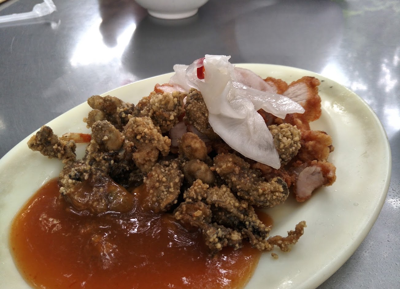 肉粥吃起來類似泡飯,炸物份量不多,口味不錯,但是吃不飽,座位是露天在榕樹下,下雨天需慎入。