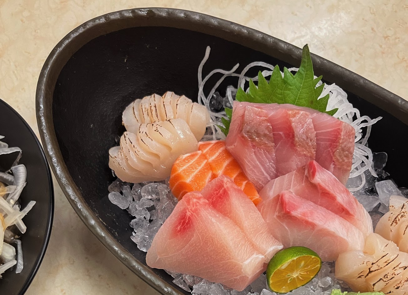 ?ㄧ品綜合刺身 420$ ?北海道生干貝 80$/一顆 生魚片的部分算新鮮 但是有幾片好像因為退冰不全所以口感有點參差不齊