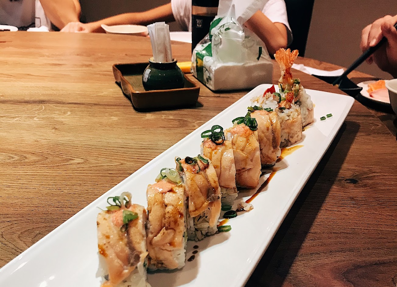 招牌雞跟毛毛蟲必點 麻油魚雜湯的魚很鹹 不推 生魚片新鮮但沒什麼存在感 炸牛蒡當小零嘴好吃