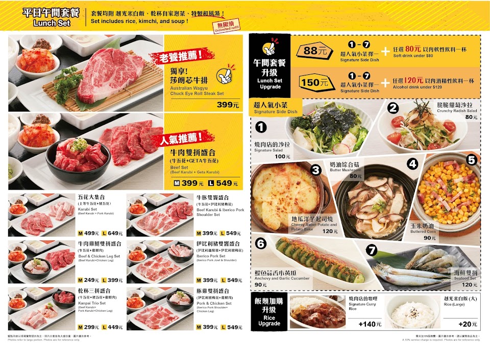 在沒有滿桌的離峰時段,用餐過程如果沒有要求,不會主動換烤網和炭火,烤到後來都是煙燻味,服務和環境可以再改善。