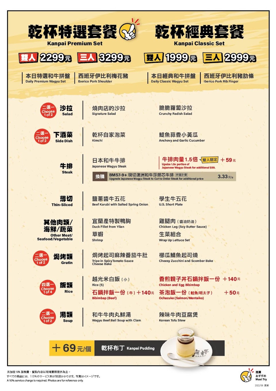 我吃過最失望的乾杯,打電話問6點半到可以吃到7點半,問可不可以提早到先入坐,他們說可以,所以我們提早6點趕來,一坐下就開始拼了命的幫我烤,一直塞,說過兩三次肉要生一點還是熟到靠北,感覺很像畜生被瘋狂餵食,完全不顧客人的用餐節奏。6點37就問我要不要最後加點,機掰不是說可以吃到7點半嗎??原來中山乾杯優秀的文化就是你幾點到吃1個小時就給我滾喔?6點50幾還問我們要不要換座位到吧台可以吃到7:30,剩將近半小時而已還要換座位有必要嗎?