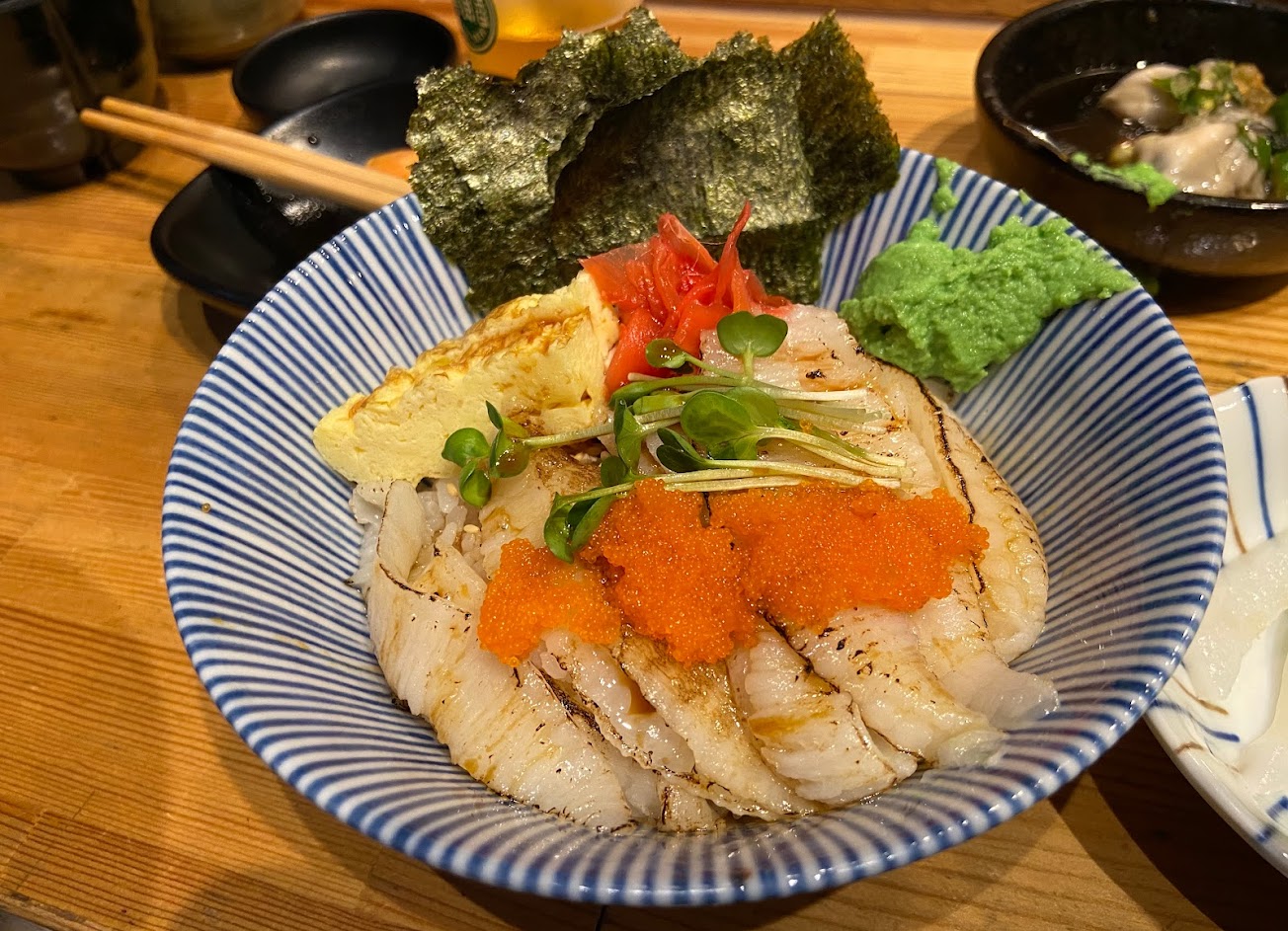很難得看到使用滿滿的鰭魚為主題的丼飯,鰭魚充滿大海鮮甜的油脂,炙燒過後的香氣讓口水止不住狂流,鰭魚一片片的撲滿整碗丼飯十分漂亮閃爍著油光,呼喊著吃我吃我的聲音;鰭魚的油脂滴下與醋飯相結合,不會顯得太過油膩,但陪著一起吃剛剛好,很快就將整碗丼飯扒的一乾二淨,一點都不浪費?