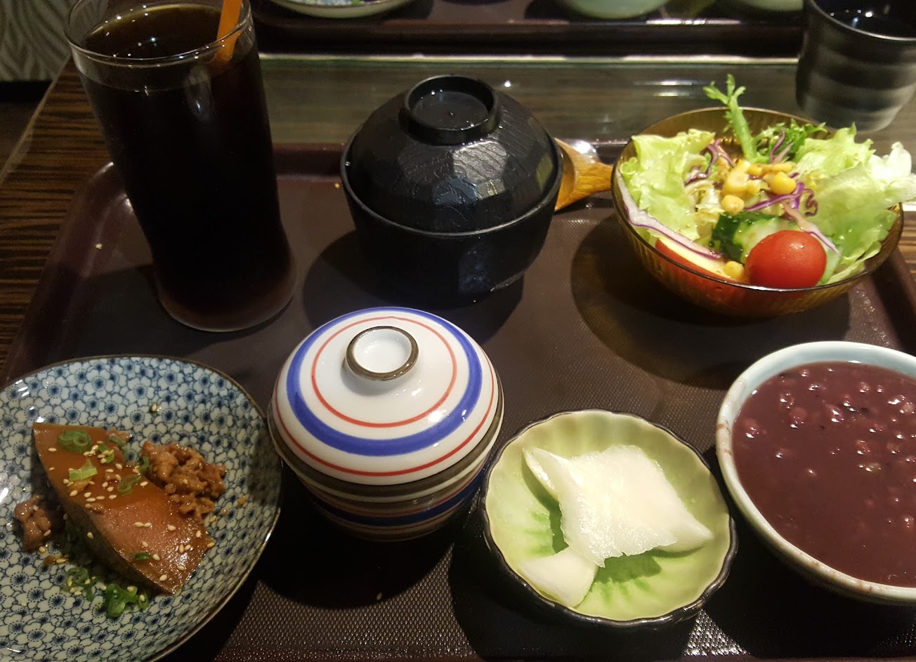 和家人一同前往,點了不同丼飯的套餐。套餐的內容都是一樣的,在上主要的丼飯之前就先用托盤把整個套餐內容送上,分別有沙拉、滷南瓜、醋漬白蘿蔔、茶碗蒸、味噌湯和紅豆湯。多數內容物都還算普通,最糟的是茶碗蒸,加了很多柴魚粉仍然沒有挽救它的味道,僅僅化為沈澱在杯底的渣渣,裡面加的料又是冷凍蟹腳和罐頭玉米,打混感一覽無遺,整體口味也非常悲劇。甚至覺得把茶碗蒸從套餐中移除可能都比較好些。炸豬排套餐的豬排還不錯,然而海陸丼的比目魚十分軟爛多油,吃起來近似於很肥的肥豬肉,有點讓人震驚,喜歡肥豬肉的人可能會喜歡,反之則否。另外隨附餐送上的湯匙明顯未洗乾淨,上面很多黏住的殘渣擦了很久才擦掉,潔癖者可能不適合來此用餐。