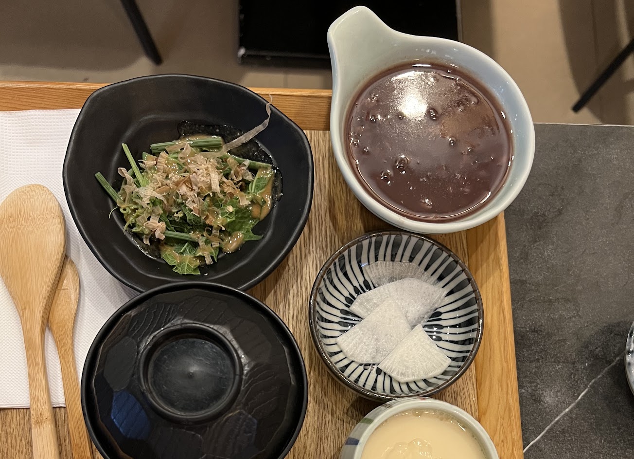 定食有附: 茶碗蒸(裡面有蛤蜊魚板 醃蘿蔔 炸甜不辣+高麗菜絲+小黃瓜 柴魚片龍鬚菜 味噌湯 紅豆紫米湯