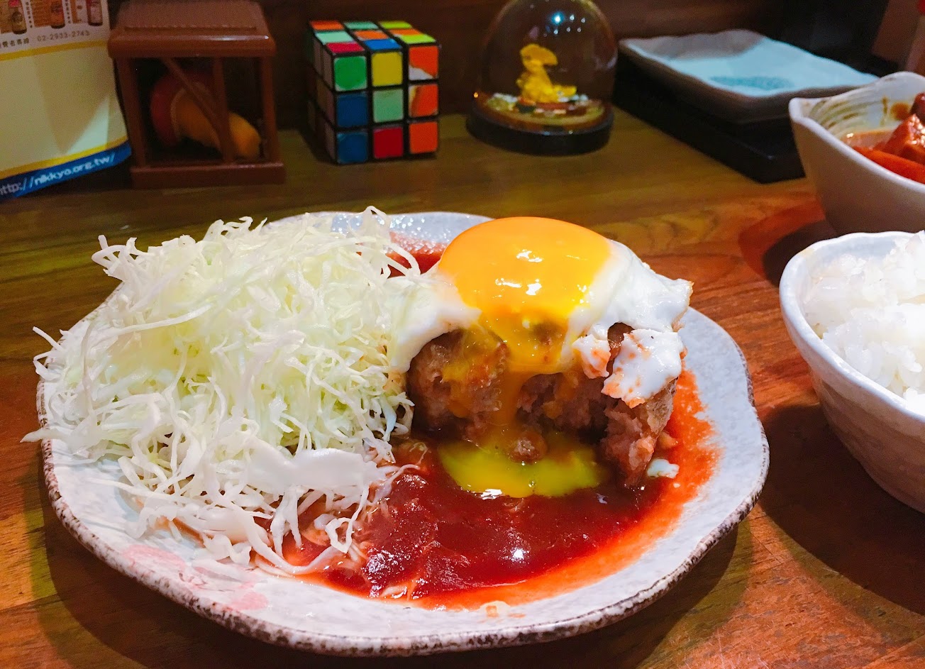 手作煎蛋漢堡排,輕輕把蛋搓破,讓蛋黃慢慢流在漢堡排上,這畫面絕對是讓人口水滴滿地的一幕,日本老闆做出來的豬肉漢堡排,厚實又多汁,全熟的漢堡排卻一點都不乾柴,老闆的功夫了得,可惜因為那畫面太吸引了,讓人一口咬下,沒有拍到那完美的斷面秀。