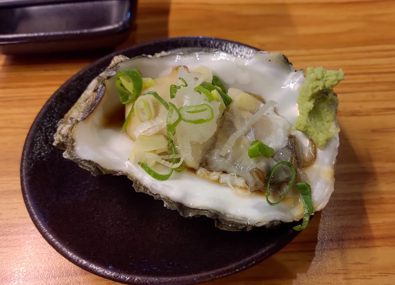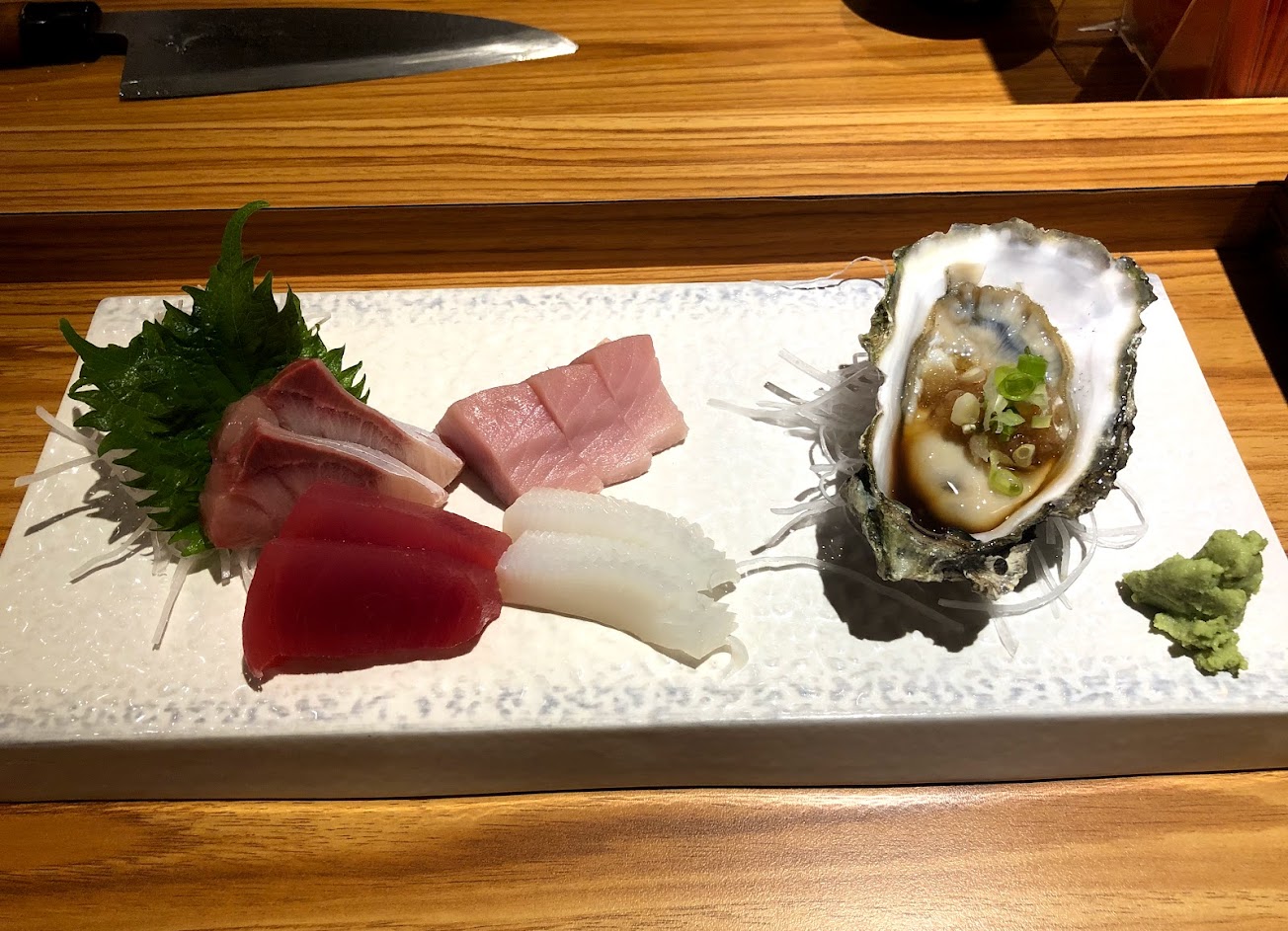 綜合生魚片有烏賊、初鰹、青甘和鮪魚赤身。 ·烏賊,表現很好,切花和色澤都很美,入口口感很棒鮮味很足! ·初鰹,是這次最讓我驚艷的,我一開始以為是旗魚,因為那個顏色有點像,但是粉紅色更多。一口後我實在是耐不住好奇就問了師傅,他就說這個是當季的初鰹。口感入口即化,油花甚似中腹肉,雖然甜度不及,但是整體質感是相當好的。 ·青甘,一直是我很喜歡的生魚片之一,這次的表現也相當好,甜味和爽脆感都很棒,但是希望下次可以吃到更肥的。 ·赤肉,我最不喜歡的一種生魚片,但是這次的體驗卻很好,一口咬下完全沒有咬到筋的不舒服感,如果喜歡紅肉質感的人一定會喜歡的。 ·生蠔,我最喜歡的料理之一。我看到一大盤生蠔放在料理台我就知道這個今天一定要來試試,這次的生蠔鮮度很足,簡單的配上清醬油和青蔥就很清爽,如果是對於喜歡清爽風味的朋友應該會喜歡的(但是我更喜歡檸檬汁,這樣更能吃到生蠔完整的風味)。