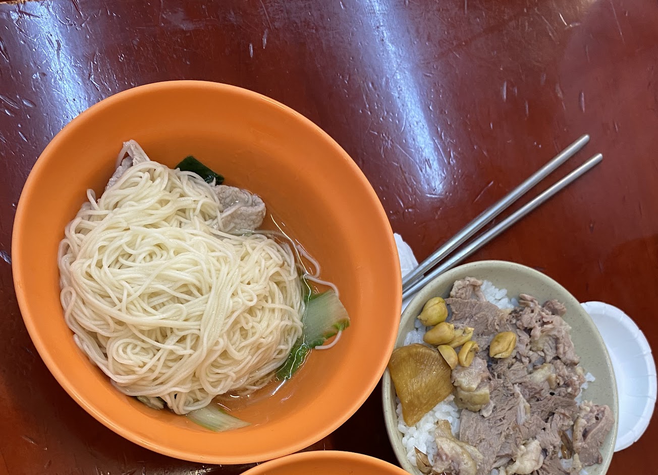 鴨肉涼麵有死鹹,麵條不好吃;高麗菜湯尚可,可以續湯,中藥味明顯。無法接受筷子油,還有洗好筷子上面有一根菜渣……挑筷子感覺在避雷