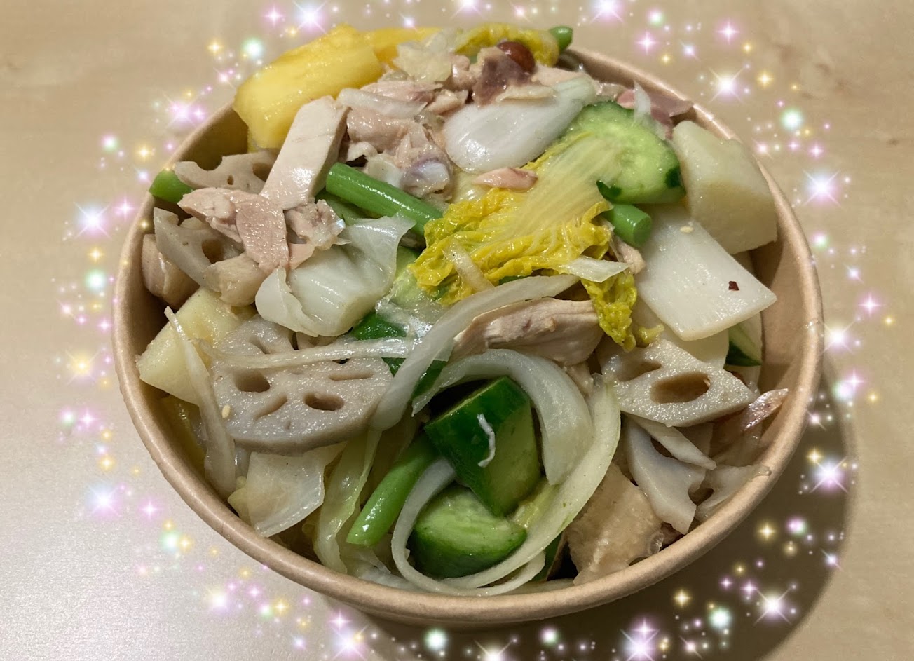 在別處也吃過鹽水雞搭配新鮮多樣的原型蔬菜,但這種酸辣調味是第一次吃到。