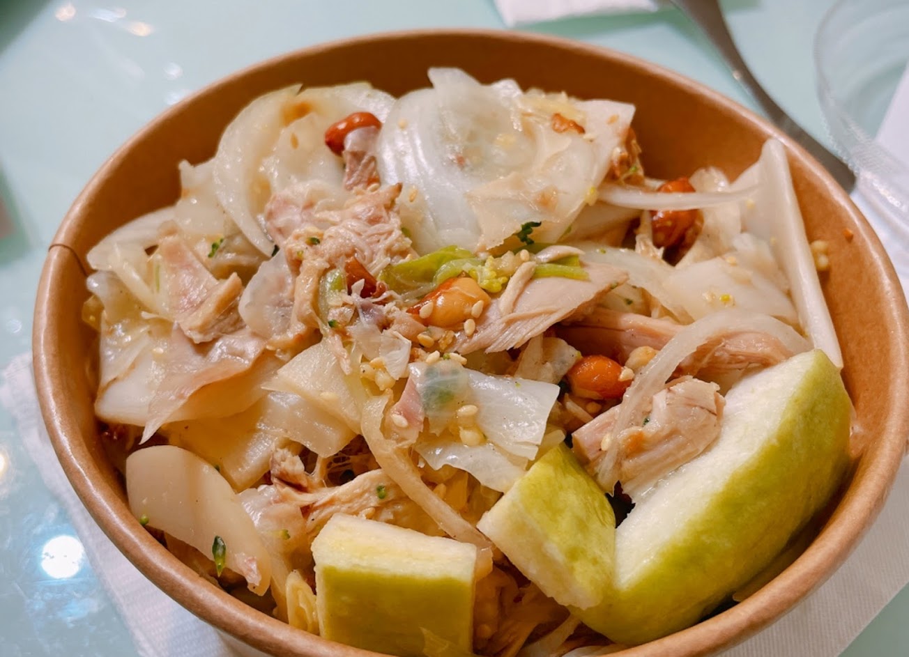 這間的味道比較清爽,沒那麼鹹,吃完嘴巴不會有濃濃蔥蒜味,而且有用檸檬提味,味道比較有層次,雞肉又很嫩,除了蔬菜和雞肉外,老闆還會另外加花生、洋蔥、筍片、水果,吃起來很豐富,我覺得很適合附近的上班族,而且份量很多,真的可以吃的很飽。