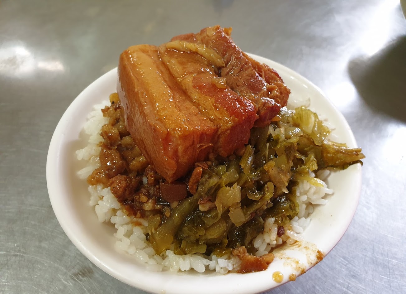 在巷間的小店,客人卻意外的多,我平日12點到,需稍加候位及併桌,但等候及出餐時間不會很久,算是很有效率的一家店。營業時間從早到中午,推測可能是當地人的台式早午餐,而中午則能提供附近上班族跟學生飽食一頓。 今日點了控肉飯及排骨湯。控肉飯滷得油亮軟嫩,而意外的是,我最喜歡的竟是酸菜!酸味不衝也不鹹,且帶著甘味,十分畫龍點睛!酸菜及滷汁的份量都十分準確,與白飯能均勻拌合,一口控肉一口飯,不僅咬到肥肉時不會膩、咬到瘦肉也不會乾,不知不覺就能完食一碗(平日我不吃飯的XD) 另外點了排骨湯,排骨酥及菜頭都給得很大方,佐之白胡椒粉及香菜的提味使層次更豐富,排骨酥無骨且大塊是優點,偏偏口味沒對到我的胃口?,且肉大塊處反而咬起來偏柴(畢竟是排骨酥啊~可能炸太久了…)下次會選擇菜頭湯就好。