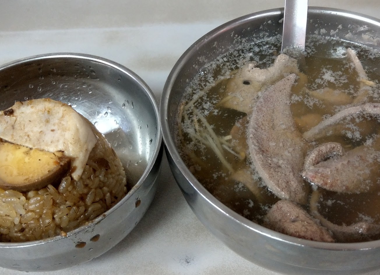 豬肝湯 很薄 軟 好吃 米糕 只有表面貼的半小片很薄的肉片 和1/8顆滷蛋 只是調味醬油飯 還好加上甜辣醬好吃 餐點:3 服務:4 氣氛:3