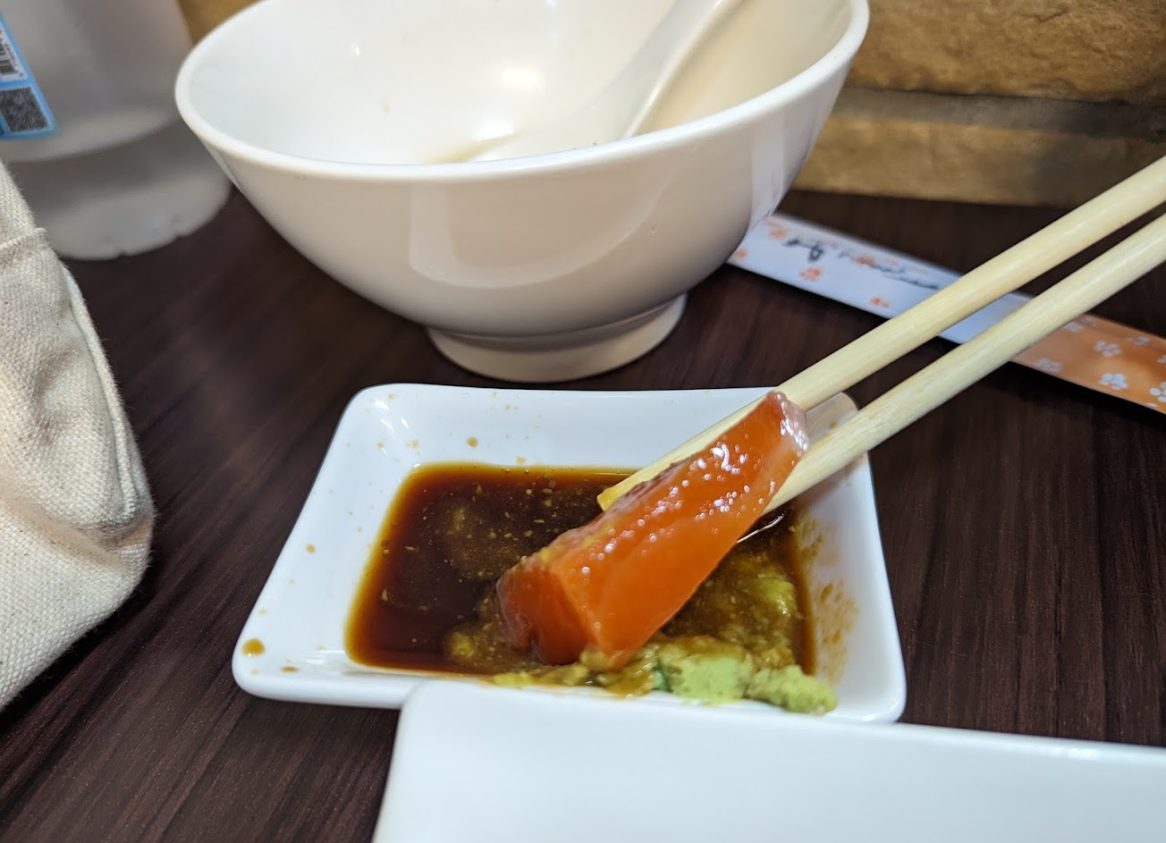 現在談到最重要的部分:食物。他們的生魚片無疑是我的最愛之一。我點了一份綜合生魚片,但是只剩下鮭魚。魚肉新鮮,柔軟而有嚼勁,帶有淡淡的甜味。每一口都充滿了味覺上的享受。此外,他們的每一片都切的很厚,一片大概等於外面的兩片。