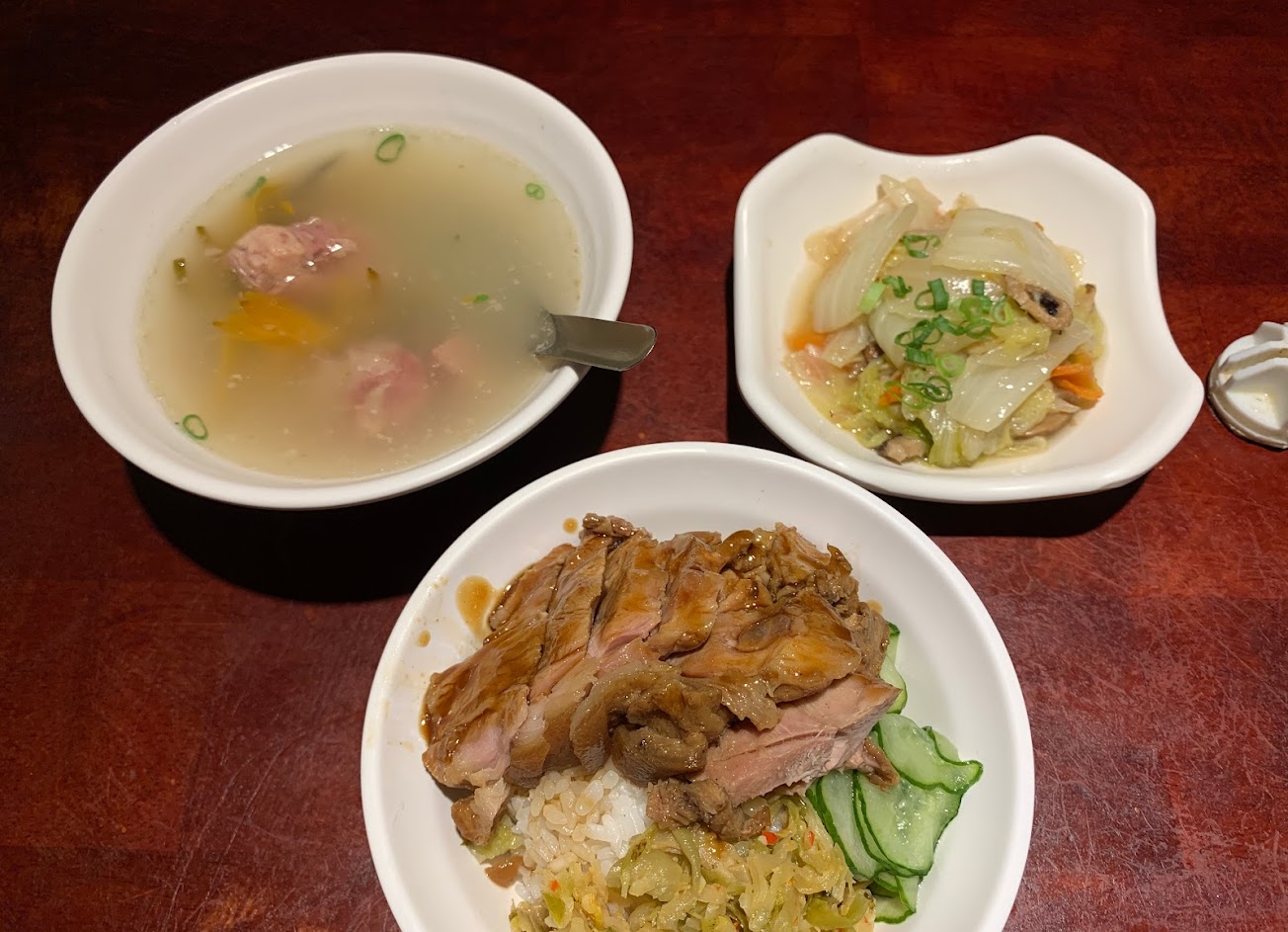裝潢很特別,看似像很古早味的小店,但食物一點都沒有古早味的味道,以為腿庫飯跟控肉飯會是便當,結果比較像是魯肉飯加肉,配菜只有小黃瓜跟酸菜,我還以為配菜會是筍絲?與其說在吃正餐感覺更像在吃點心,吃飽後超空虛?金針排骨湯也完全沒有金針的香味?比較像水被加到幾滴排骨湯汁