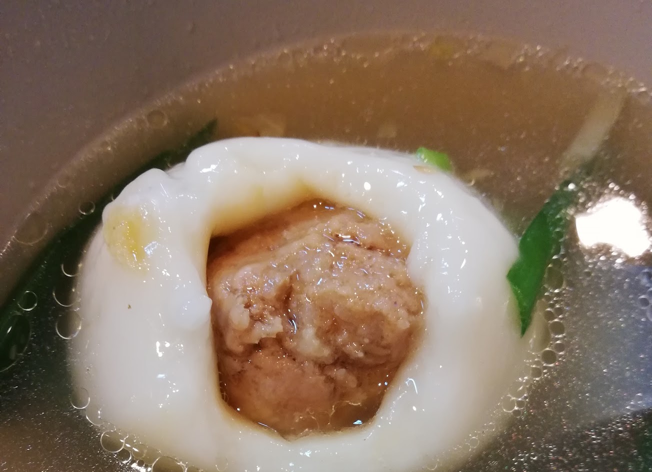 鮮肉湯圓外皮非常軟嫩Q彈,內餡味道鹹淡適中,湯頭鮮美香氣撲鼻