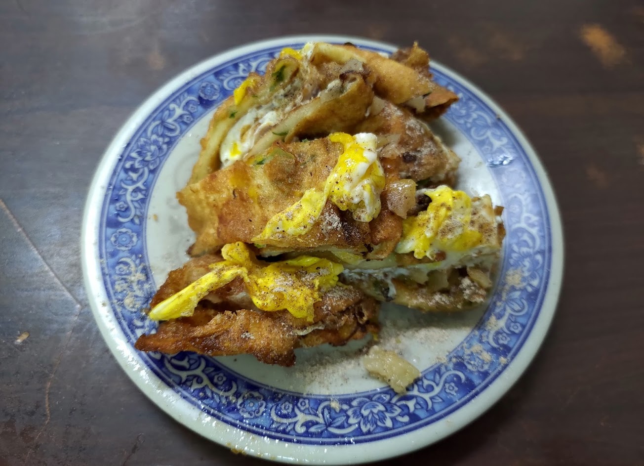 剛端上桌的,是外皮略為褐色焦酥的蛋餅 第一眼會使人有一種稍嫌油膩的印象 一咬下,餅皮中間裡的蛋液緩緩流出一份柔軟口感 同時還裹著雞蛋香氣與些許麵粉味