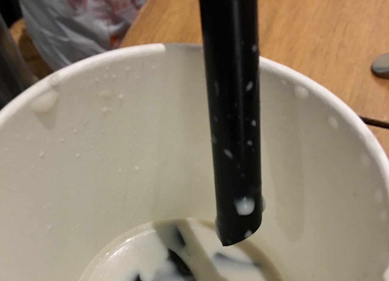 ⑵ 大瓶杏仁茶160元、小瓶80元,店員告知小瓶容量是大瓶的一半,於是我就點了小瓶,不過店員貼完貼紙後我看到小空瓶上印著435ml、大空瓶上印著970ml,與店員告知的不符,遂改點大瓶,但一樣是那個棕色長髮無眼鏡店員,「憤怒地嘖了一聲,把貼好貼紙的小空瓶擰爛,用力地往旁邊甩丟」。