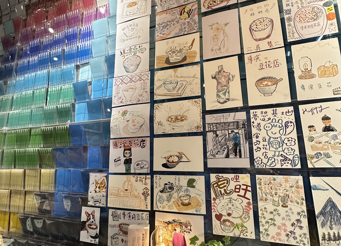 無意間在迪化街的一個相對比較靜側面,他的招牌吸引了我多走幾步,門口的導演椅和關著門的店面,端詳研究了幾分鐘才有勇氣推門探究,年輕的店員介紹說,這裡的豆花和山粉圓之外的七八種配料,都是店家自製,豆花用的是進口非基改黃豆,地瓜粉圓是自豪的特色,菜單上還標明花生每份一份,不能加量,豆花底可選豆漿或熬製紅糖水,顯然是家比較有個性的豆花店。店裡的裝潢更有個性,很熱鬧,也很文青,老闆的攝影器材、拍片的劇照、得獎的證書比比皆是,不過,這只是點題式的部份元素,一面用彩筆拼成台灣地圖的創意牆邊,一牆的漫畫或隨手畫,是客人隨性的自由作品,而更引人注意的,則是滿牆的小方卡片,每一張上都有簡單的感謝句子,甚至還有老師簽名,原來,店家每個月都提供600張空白小卡片給附近的大同、蓬萊、永樂、太平等四間小學,老師們認為表現好的學生可以得到一張卡片,然後可以憑著來換取一碗免費豆花,而這個具有相當啟發意義的公益活動,源自於老闆何明瑞導演曾經的豆花車行動,據說他的夢想就是能到各個偏鄉,用豆花吸引兒童的注意,然後教他們如何拍攝人文的影像紀錄,後來,這棟老房子的主人「財團法人至善堂」決定把這個保存良好的迪化街老宅免費借給導演,以延續他的夢想,條件就是得用具體行動回饋、幫助下一代,這個夢想基地就這樣鮮活的出現。在這裡享用豆花,沈浸在文青文創氛圍裡,啖一口清爽的手工滋味,品一番人文的底蘊,好不愜意!