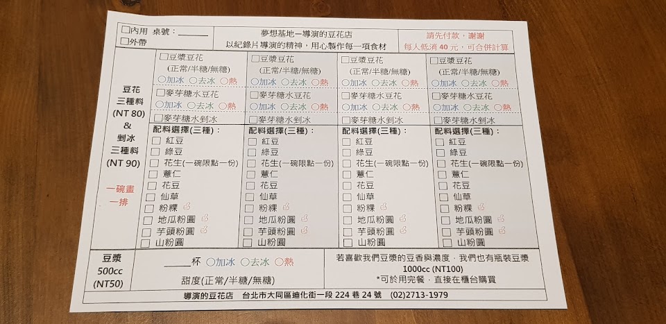 豆花好吃,環境非常優,店員都很客氣,進來及離開櫃檯小姐都非常有禮貌,也會開發票,同天吃了大稻埕某家杏xx腐冰就沒發票,故導演的豆花一定會再回訪,好店要支持?? …