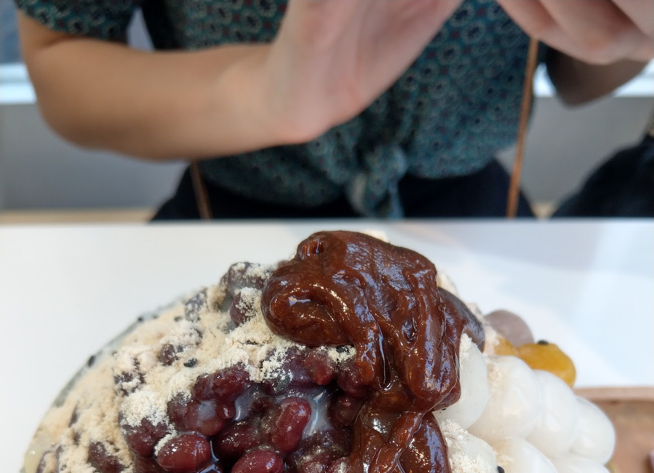 湯圓很有口感 麵茶香濃 紅豆有鬆喔! 冰的口感適中 不會太細、或太粗 以份量來說 價格略高
