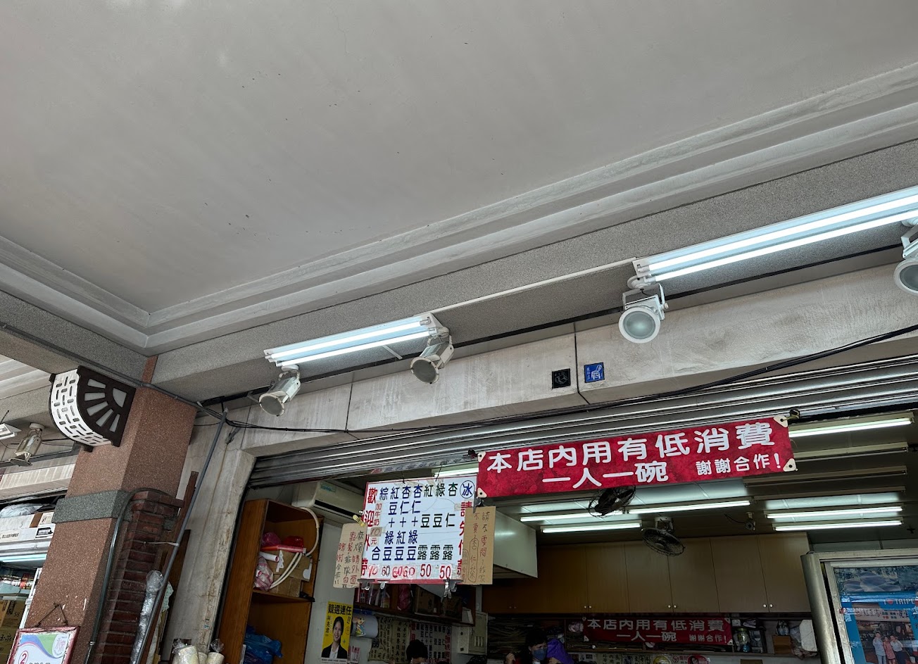 老字號小吃,不過來點餐要記得先通過老闆娘這一關,想吃的話千萬不要先嚇到或森77才行。這裡的餐點分為冷/熱兩種,想吃杏仁露只有冰的選擇,可以搭配綠豆/紅豆或綜合,上面會有一坨挫冰,冬天的話不想吃冰得可能要考慮一下;至於想吃花生的朋友很抱歉只能選熱的那一邊,熱的部分也有比較多選擇,建議先決定好再去店門口。