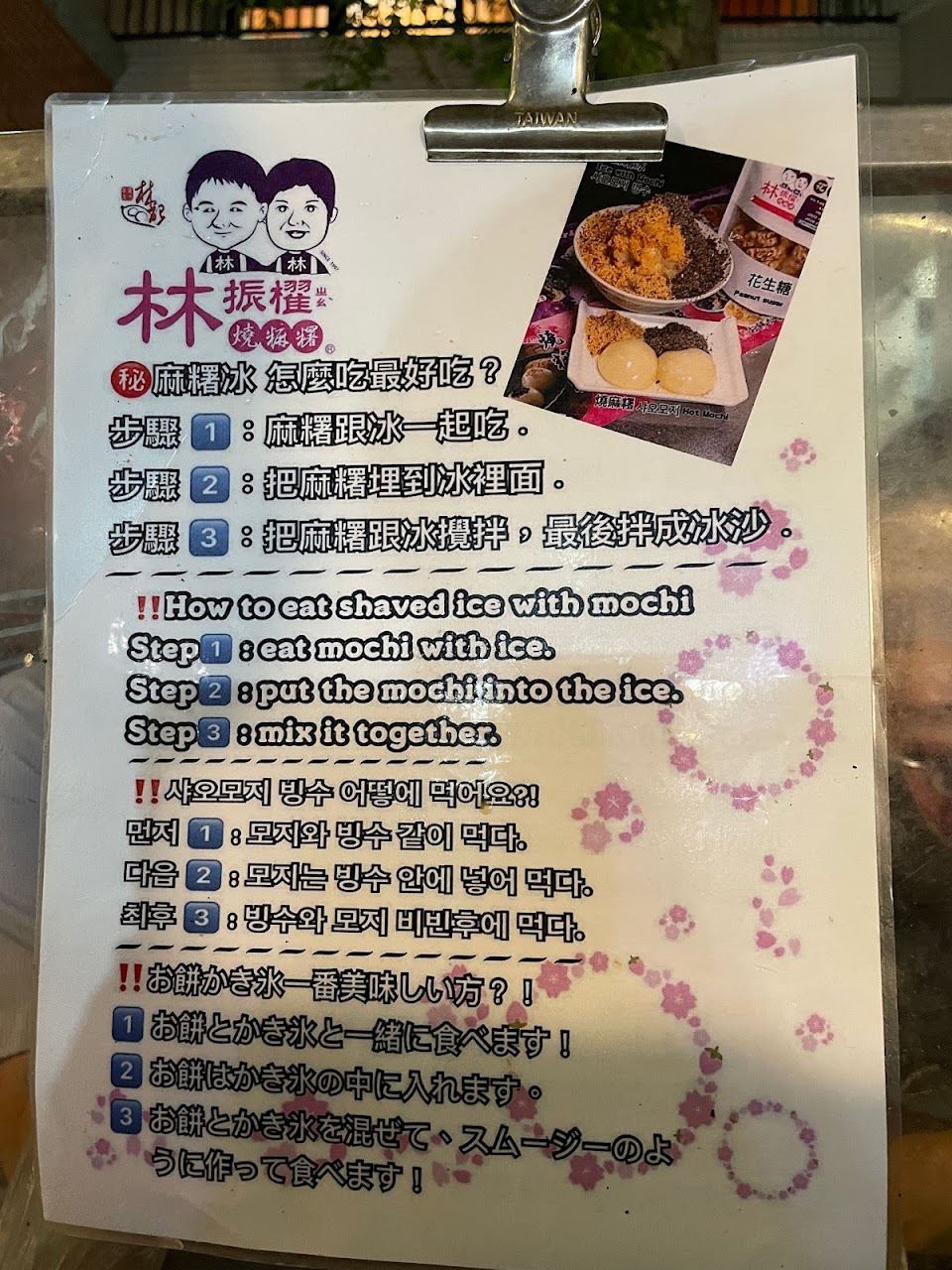 麻糬冰看起來比實際上吃起來好!點子很好,建議可以把糖水做的更有特色,麻糬放在刨冰上面吃,雖然可以嘗試兩種口感,但還是覺得單獨吃燒麻糬更好,花生粉和芝麻粉需要咬,刨冰吃到嘴裡就化了,所以口感不是很協調!