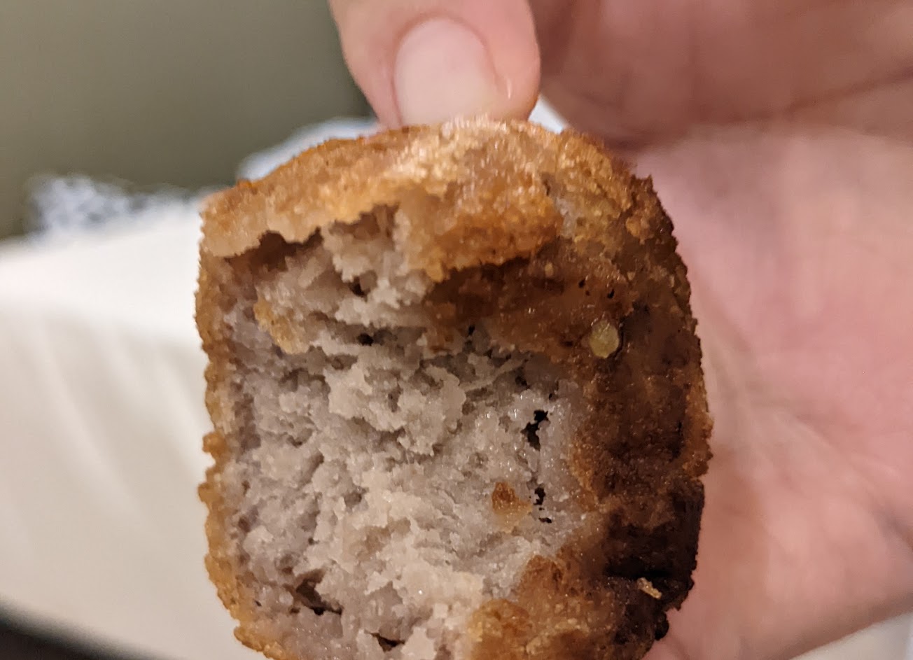 芋頭丸剛炸好時,外皮酥脆,內餡甜鹹適中
