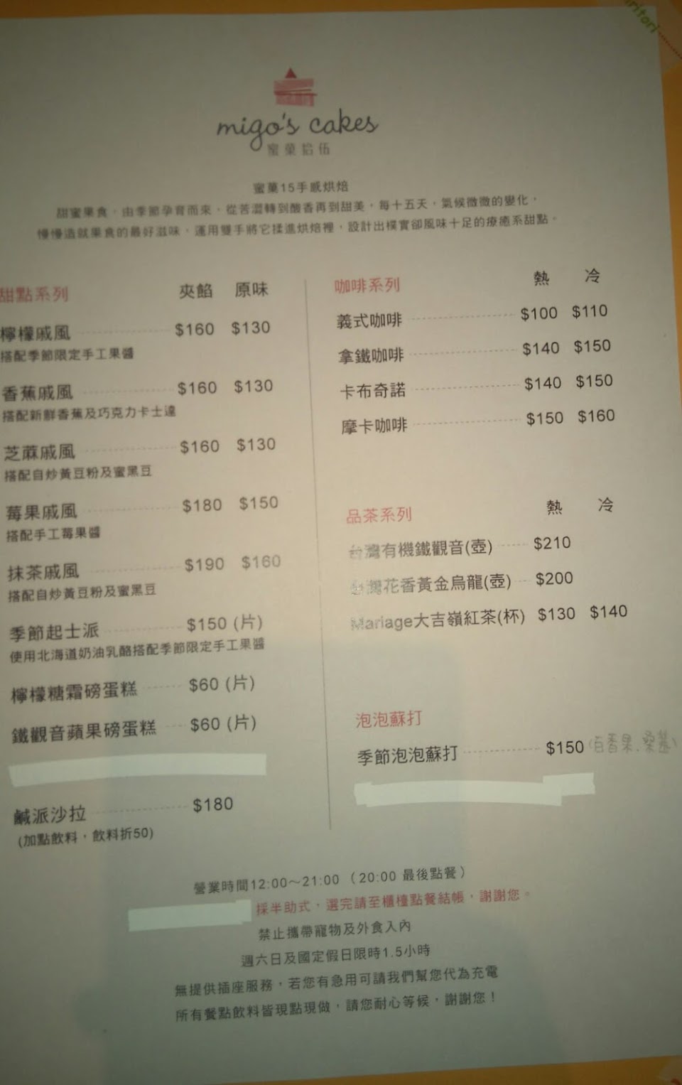 假日用餐限2小時,但沒客滿店家也不會要求時間到就需離開。 藍莓派微甜不酸,非常美味。 鐵觀音奶茶很香,拿鐵也不錯。 抹茶戚風剛入口會覺得有點微苦,搭配上不甚甜的紅豆還蠻剛好的。 店家很親切,餐後還會詢問一下對於餐點滿意與否。 店內座位數不多,怕撲空可先電話訂位,低消為一杯飲料,不另收服務費。 這次的用餐經驗覺得很不錯~