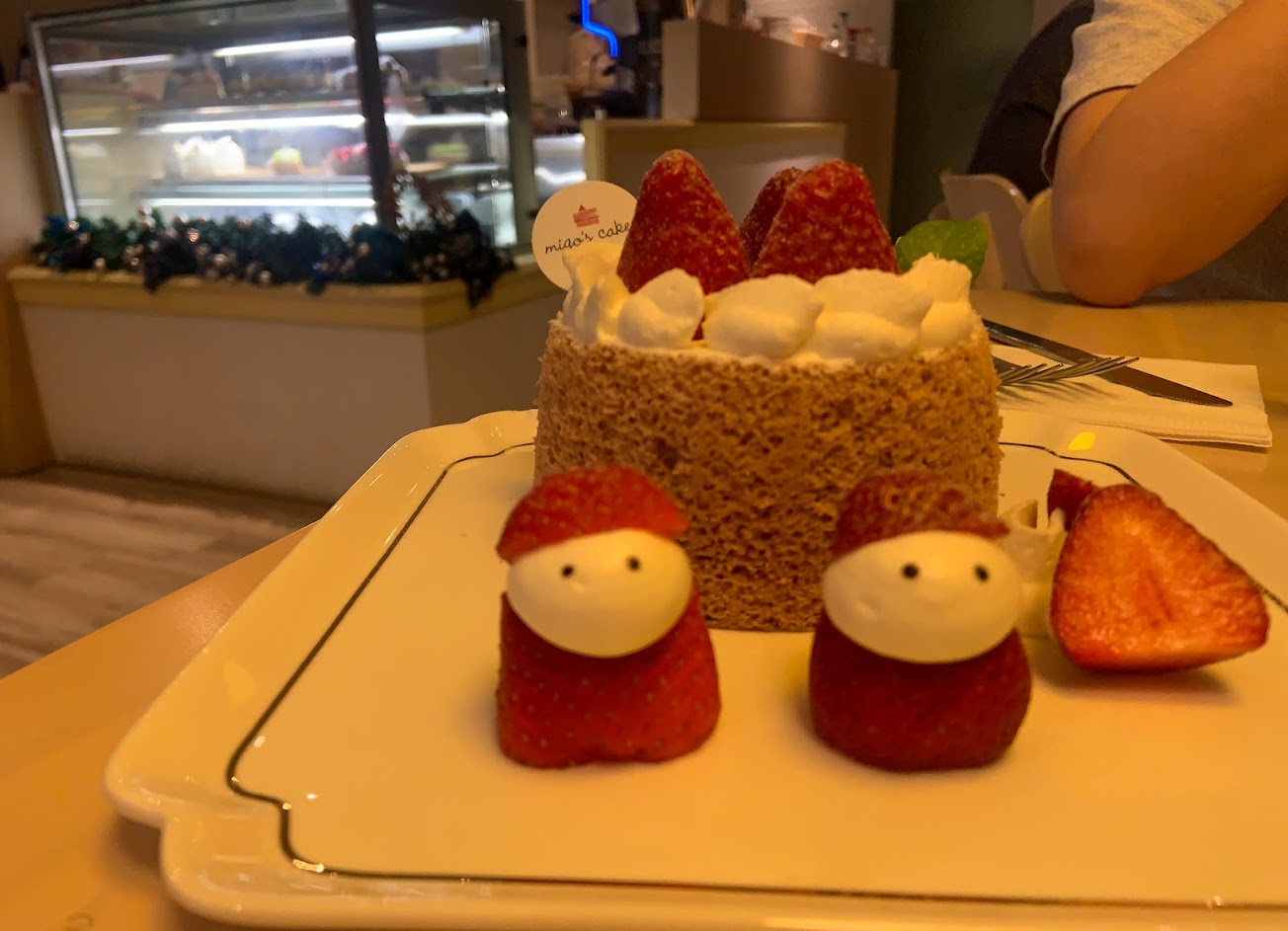 店家的戚風蛋糕內的奶油很好吃,不甜不膩卻很有味道,是會讓人一直吃的口味。前面那兩個草莓人很捨不得吃。