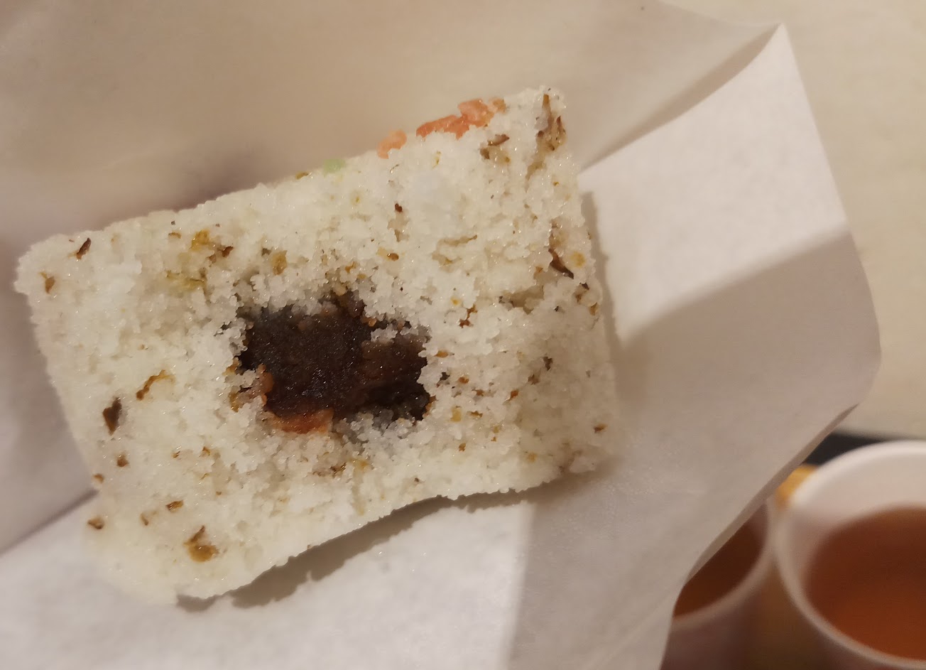 鬆糕是用在來米粉或糯米粉等米粉做成,雖然和某些傳統的糕、粿原料相同,但是鬆糕的口感較鬆散、偏乾;豆沙吃起來是烏豆沙,味道不會太甜、對於像我這樣嗜酸的人剛剛好,對於螞蟻吃貨來說可能不夠味。