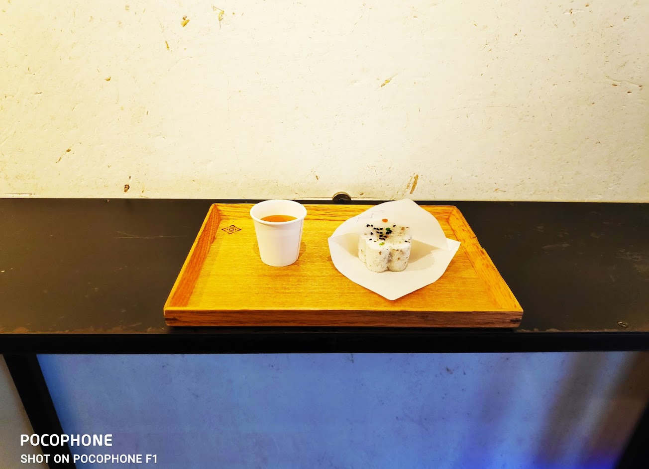 詢問店員的推薦,我們點了最熱門的「鬆糕」系列,我選了桂花豆沙,覺得很特別,因為店家還會另外幫你用蒸籠蒸熱(還有搭配計時器) 朋友點了黑米花生,相比之下,我們比較喜歡桂花豆沙鬆糕。 戶外享用,店家還會額外附上一小杯試飲的熱紅茶(紅玉、台茶18號) 我們都覺得茶好好喝 ????