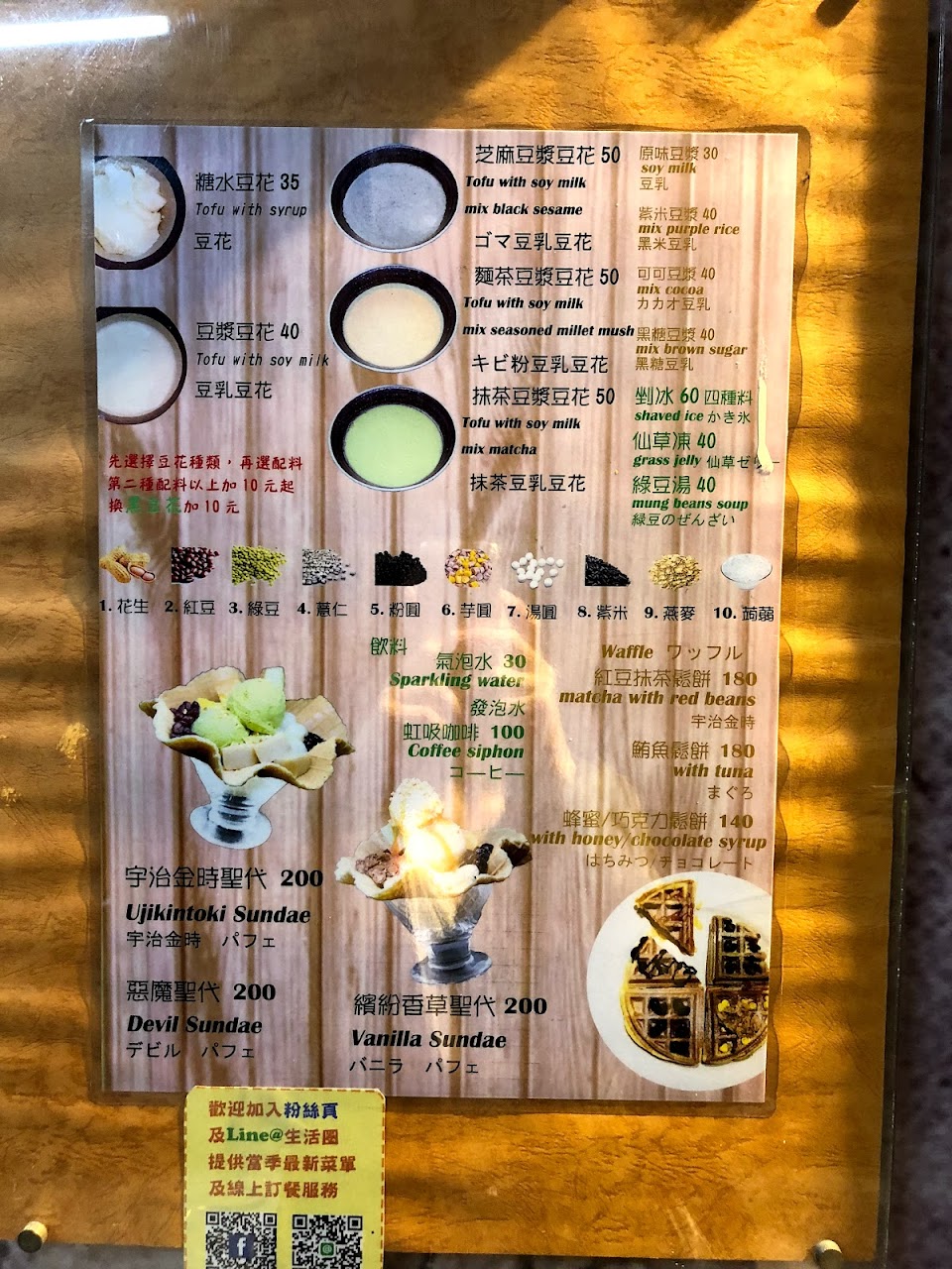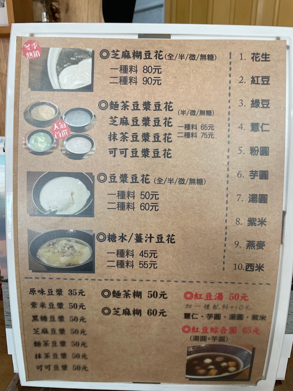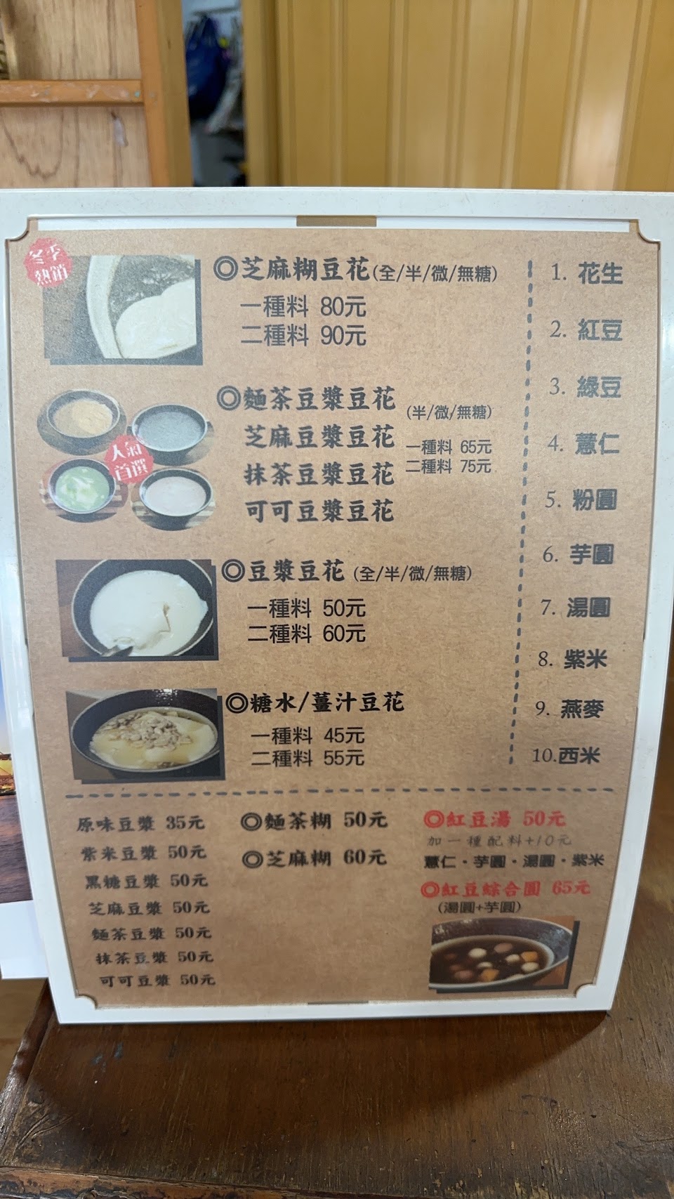 推薦:麵茶/ 抹茶豆花,紫米、綠豆、花生都很綿軟~