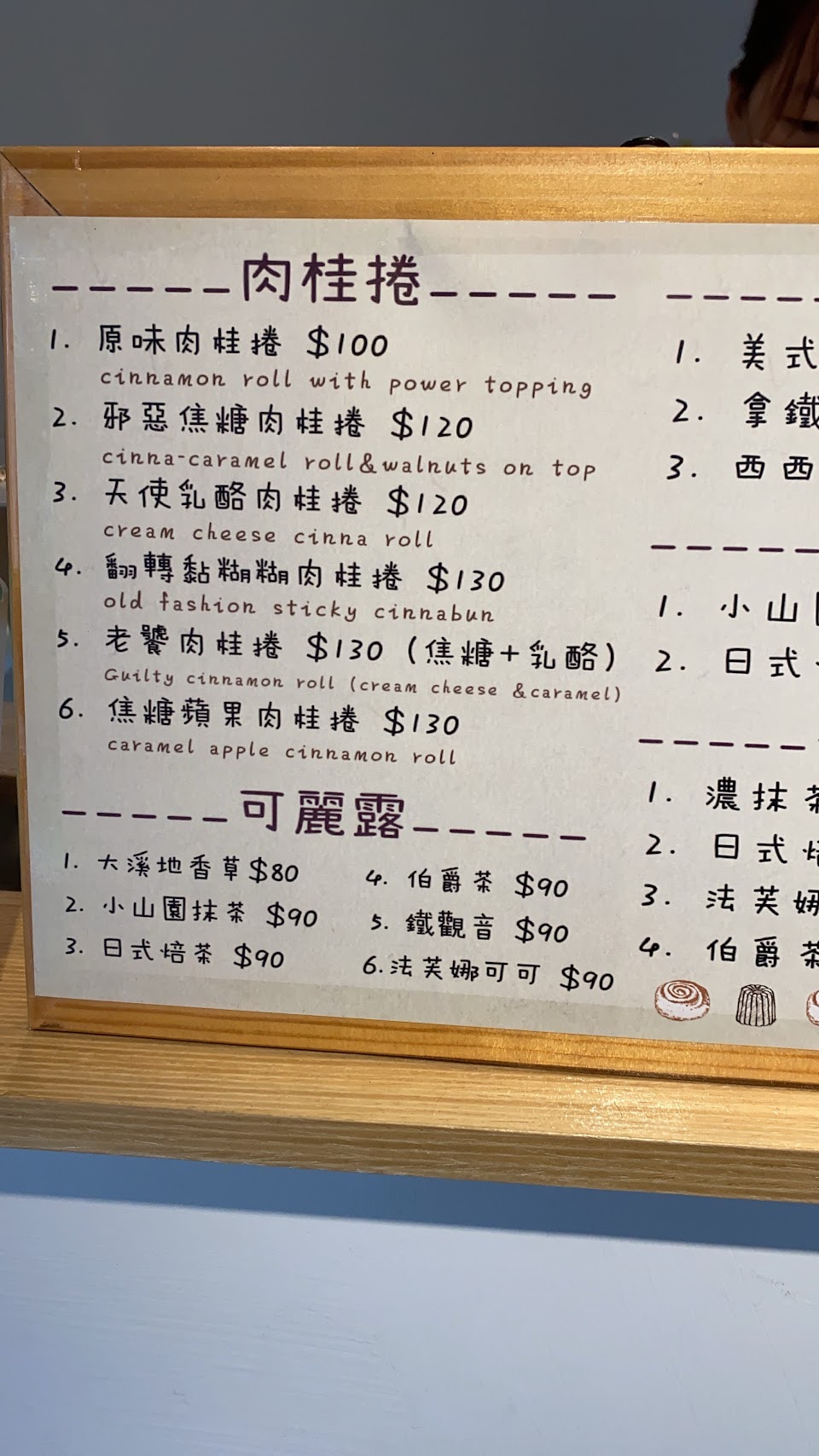 大溪地香草可麗露$80外脆內軟好吃,原味肉桂捲$100中規中矩,邪惡焦糖肉桂捲$120焦糖有點把肉桂的味道蓋過,蘋果肉桂醬比較辛辣。