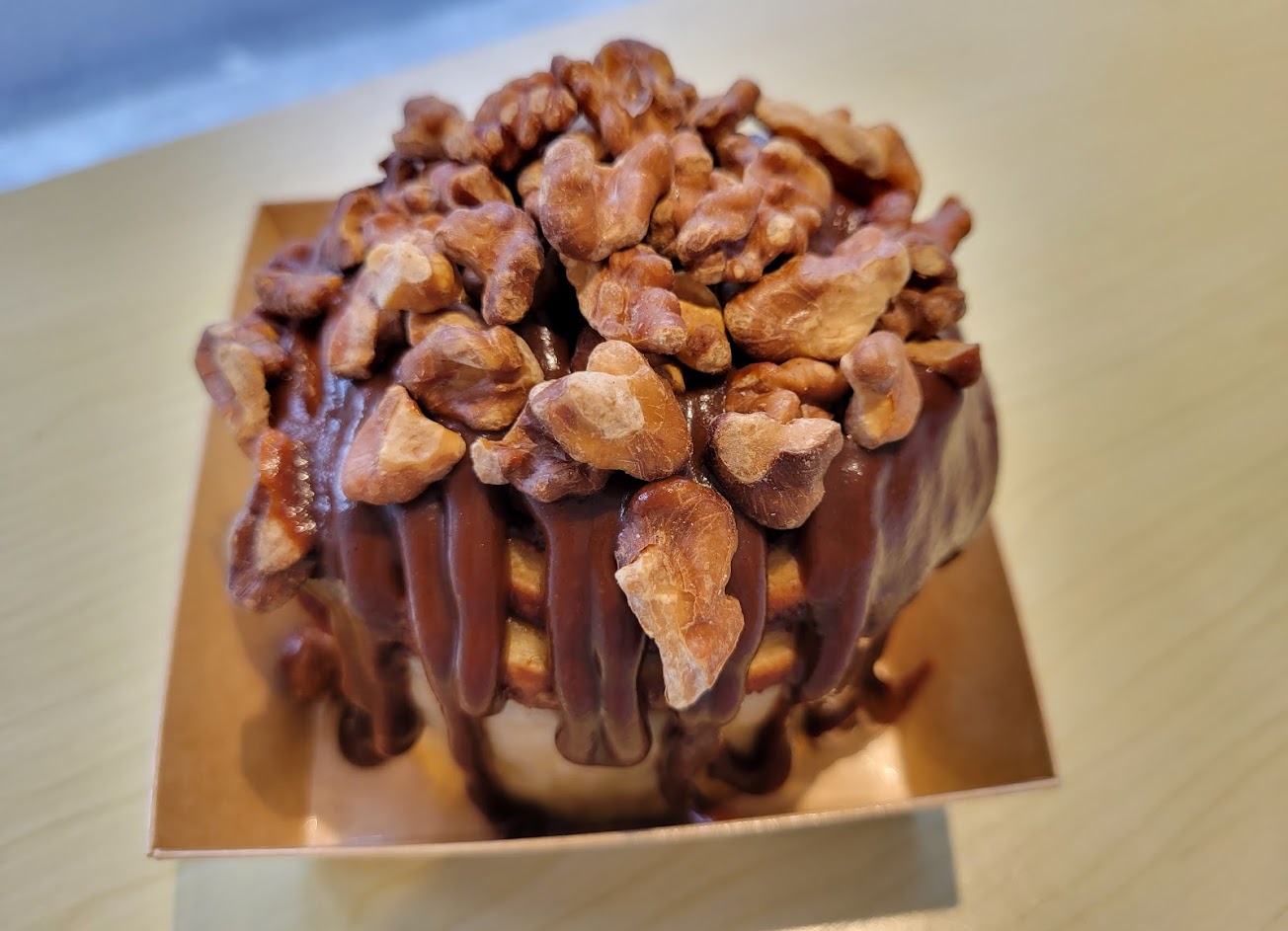 會想來吃,就是被上面滿滿的淋醬及核桃所吸引,一入口就是核桃粒,增添口感,與淋醬相得益彰,接著就是最愛的肉桂味,或許是因為對肉桂的接受度高,所以覺得其他網友評論説的尾段的辛辣感還OK,甚至覺得既然名為老饕,其實可以再重一些也無妨(不過相對地淋醬的甜味要降低或減少淋醬的量,不然兩邊都很多口味太重反而就不好吃了)。
