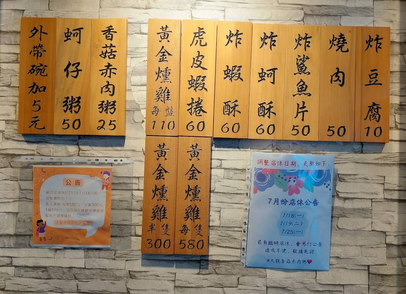 曾經聽到老闆說搬店是為了改善衛生環境品質,我也相信老闆的話,但是最基本的味道要守住啊,炸物份量我可以理解是衛生環境和租金成本,只是今天再次光顧,粥已經幾乎沒有以前的味道了,然後看到價目表全部漲價,已經沒有cp值可言,吃了超過15年啊!唉,真的可惜了。