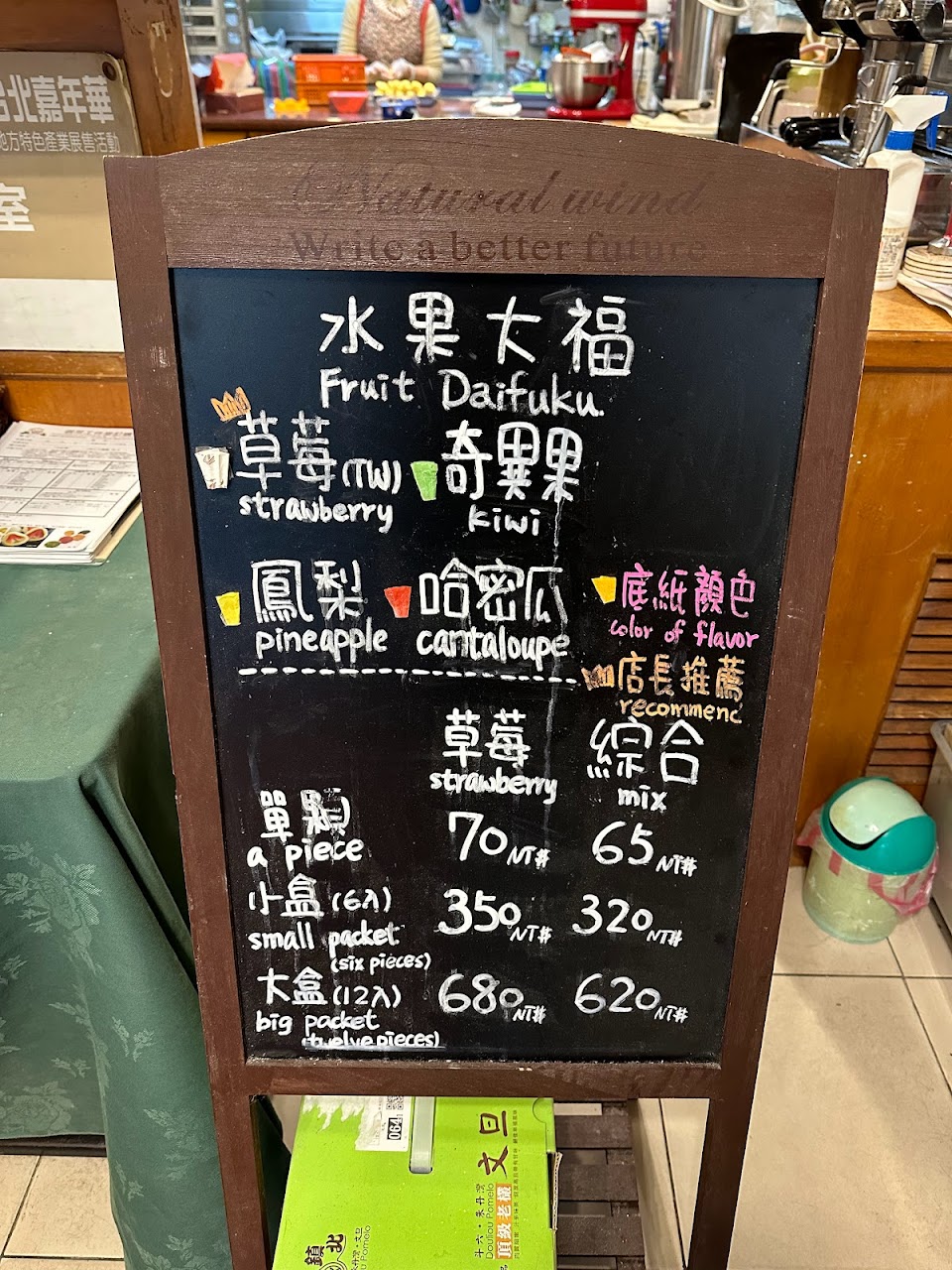 今天去買綜合大福要跟爸媽一起下午茶。很樸素的一間小店,卻是我吃過最喜歡的大福。皮薄軟Q,內餡特別是清爽不甜膩的綠豆沙,水果新鮮、大小也很實在。從此是我的首選店家。