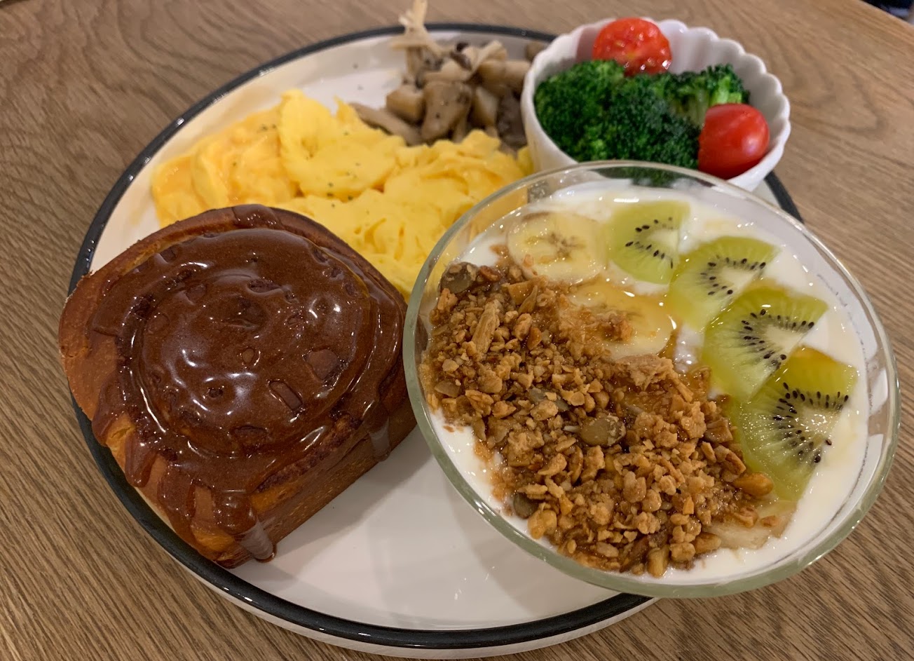 健康又邪惡的餐點,建康滑蛋、綠花椰菜點綴小番茄再加上一碗原味無糖優格,上面舖了碎堅果、香蕉片、奇異果及沉在下方的蘋果丁淋上一些蜂蜜,是不是健康極了,但可惡的不能錯過肉桂卷,喜歡濃郁肉桂的捧油絕不能錯過。心情鬱悶或大姨媽拜訪的好友熱可可催下去,真是既健康又邪惡。