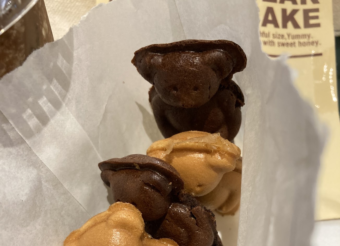 這間店的位置蠻不起眼,小小一間。買了6隻小熊燒120元,巧克力跟蜂蜜口味可以混搭,數量很彈性可以隨意指定,可以一半一半也可以讓喜歡的口味多一點。