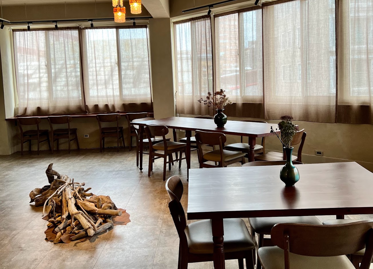寬敞簡約的空間, 以大地色系做配置, 大面採光搭配米色的窗簾, 柔和緩慢的流光, 木質桌椅及漂流木, 讓整體空間營造一種無憂無慮的意境。