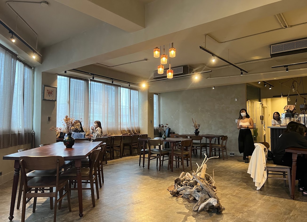 由於這棟建築本身就位於三角窗,所以能有大面積的對外窗。室內靠著窗外透進的自然光,就能打造出一個明亮的空間;店家佈置了窗紗,使得光線柔和不少。桌與桌之間有適當的間隔,桌上安排了乾燥花和有質感的花器;場地中間的地面則佈置了漂流木柴堆,使空間變得靈活彈性,視覺上也有記憶點。