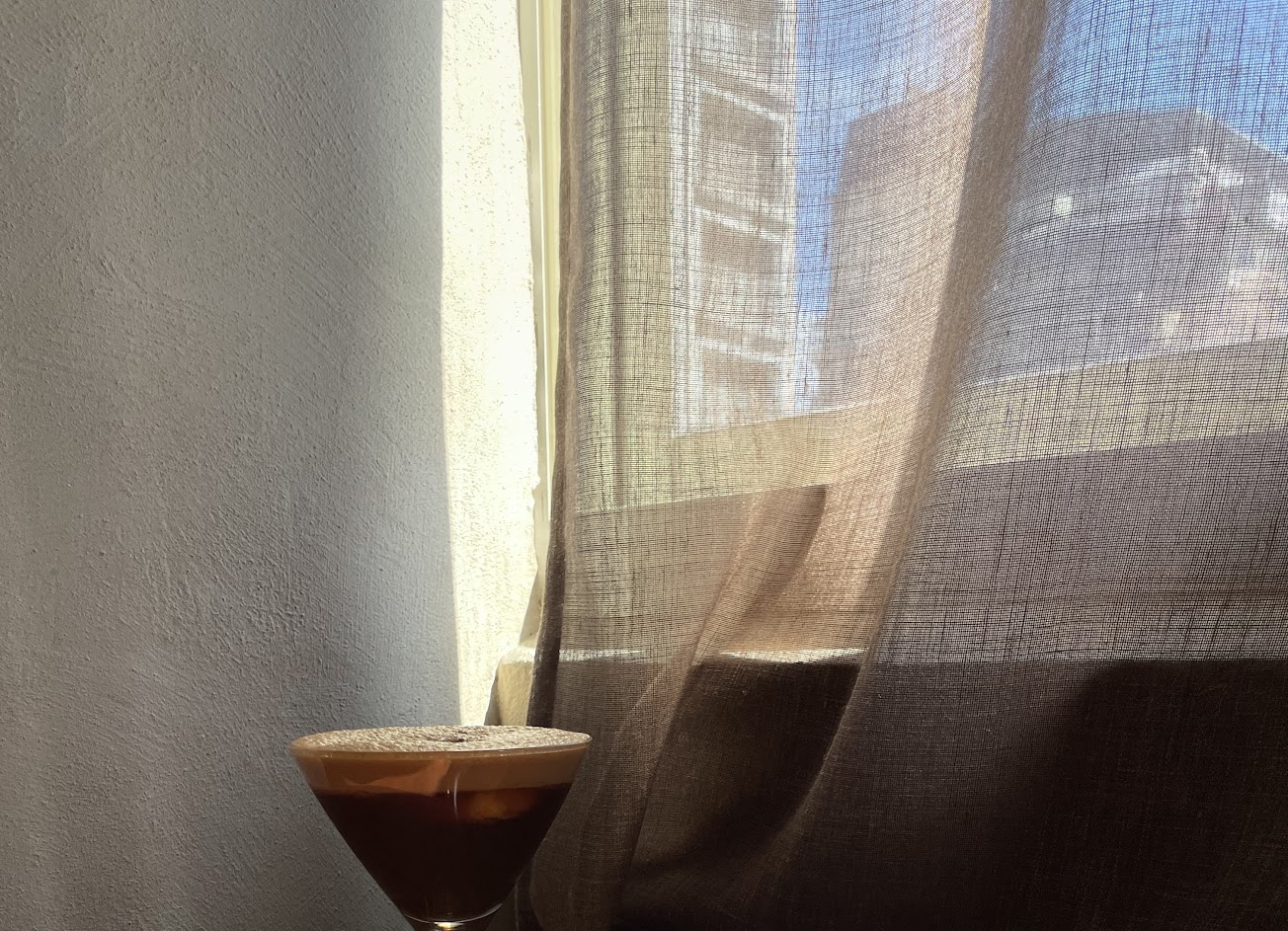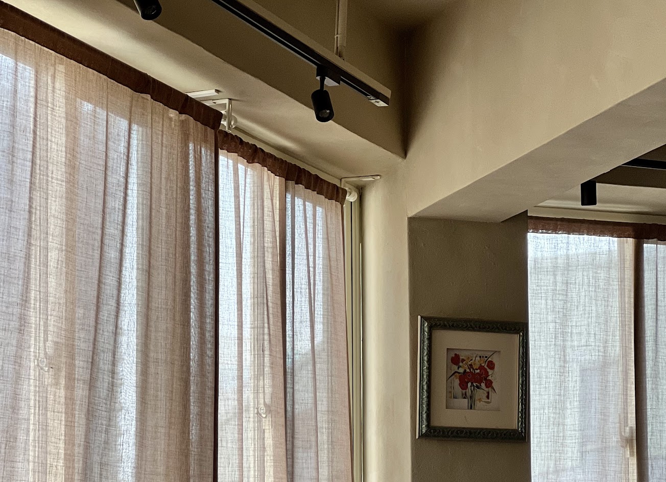 黃褐色的紗簾,讓外面刺眼的太陽光變得柔和,可以舒適、安靜地享受午後咖啡