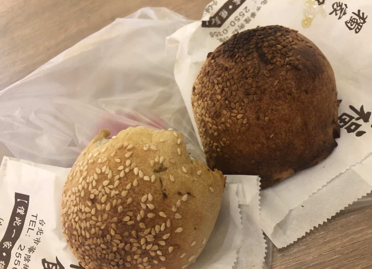 50/一顆,大約一小時出爐一次,要提早電話預約。在台北這麼多年第一次買,外皮酥脆扎實,內餡是豬肉瘦肉和青蔥,富含湯汁嘴巴要小心,別和我一樣開心地咬下一口,嘴角被燙到哈哈哈