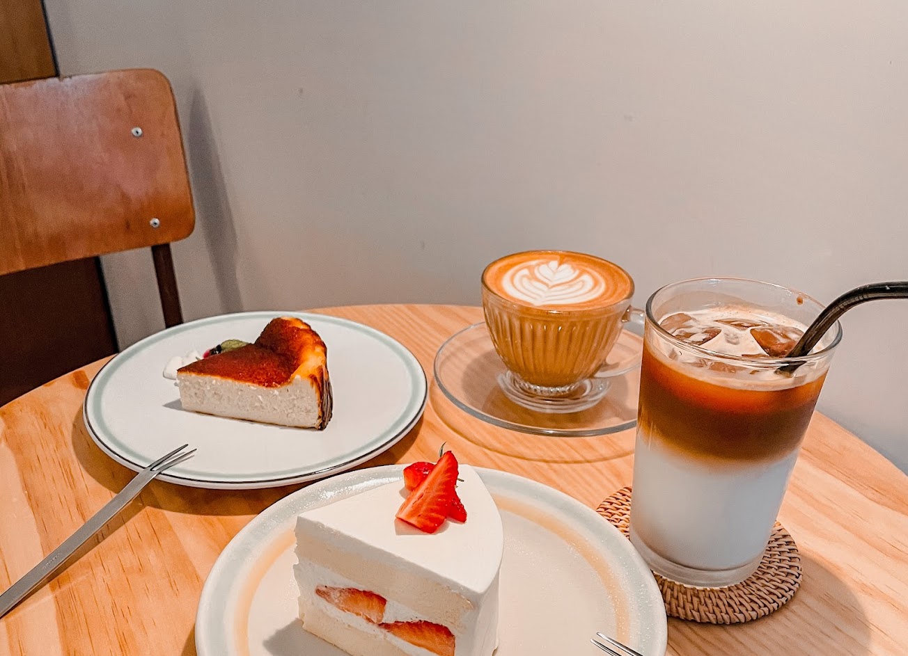 真心好吃好推!!但建議12:00準時樓下大門排位,以免因為座位數太少沒位置(但週六中午算是剛好坐滿沒人排隊)(所以雖然限時90分鐘但也沒馬上趕人~後來2點開始人越來越多我們就先走以免耽誤到其他後位者) 綠寶石抹茶奶油蛋糕:今天第一名🥇鮮奶油輕盈、青葡萄多汁且蠻甜、蛋糕體超輕盈蓬鬆!好好吃⋯不過抹茶味幾乎沒有 如果是很期待抹味得會失望XD 巴斯克乳酪蛋糕:很濃郁紮實 搭著旁邊的藍莓顆粒果醬嚐起來味道會更跳出來 不過乳味較沒這麼重(也因為才不會很膩我猜) 草莓奶油蛋糕:比較普通~鮮奶油跟蛋糕體都跟綠寶石一樣優 只可惜可能過季節了草莓雖然多汁但偏酸而無特殊香味 整體不突出 鐵木(杏仁萊姆酒拿鐵):酒味很濃郁!很香!推推 康普茶特調氣泡飲:康普茶本體味道就會有個香氣&偏酸 但搭配氣泡水很清爽消暑~